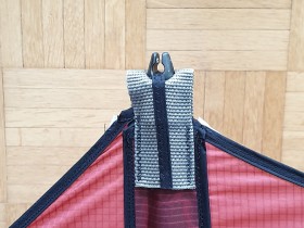 Das Dacron für Taschen habe ich mit Spi überzogen, Schlaufen, Taschen, etc. sind aus festem Gurtband mit 40mm Breite gefertigt (s. Bilder). An einigen Stellen habe ich dieses Gurtband mit einem runden Ausschnitt versehen und einen Streifen 4fach genähtes Spi-Saumband mittig darübergenäht (s. Bilder).