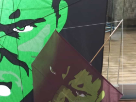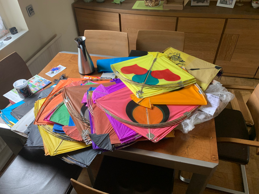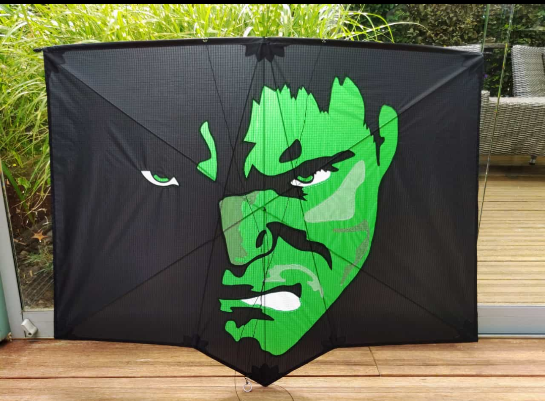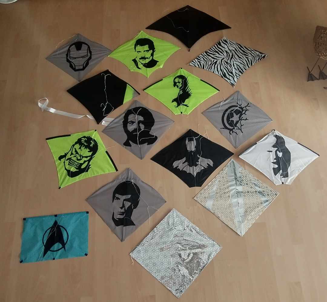 Das Motiv stammt auch von einem Fighter, den ein Freund bei einer Raffle gewonnen hat. Das ist ein Pipa (glaube ich), der aber noch nie geflogen ist. Auf dem Original ist das Motiv ein Druck, bei meinem ist es eine Applikation. Jungfernflug hat wegen des Wetters noch nicht stattgefunden, aber der Drachen ist ja auch erst heute fertig geworden ![]()