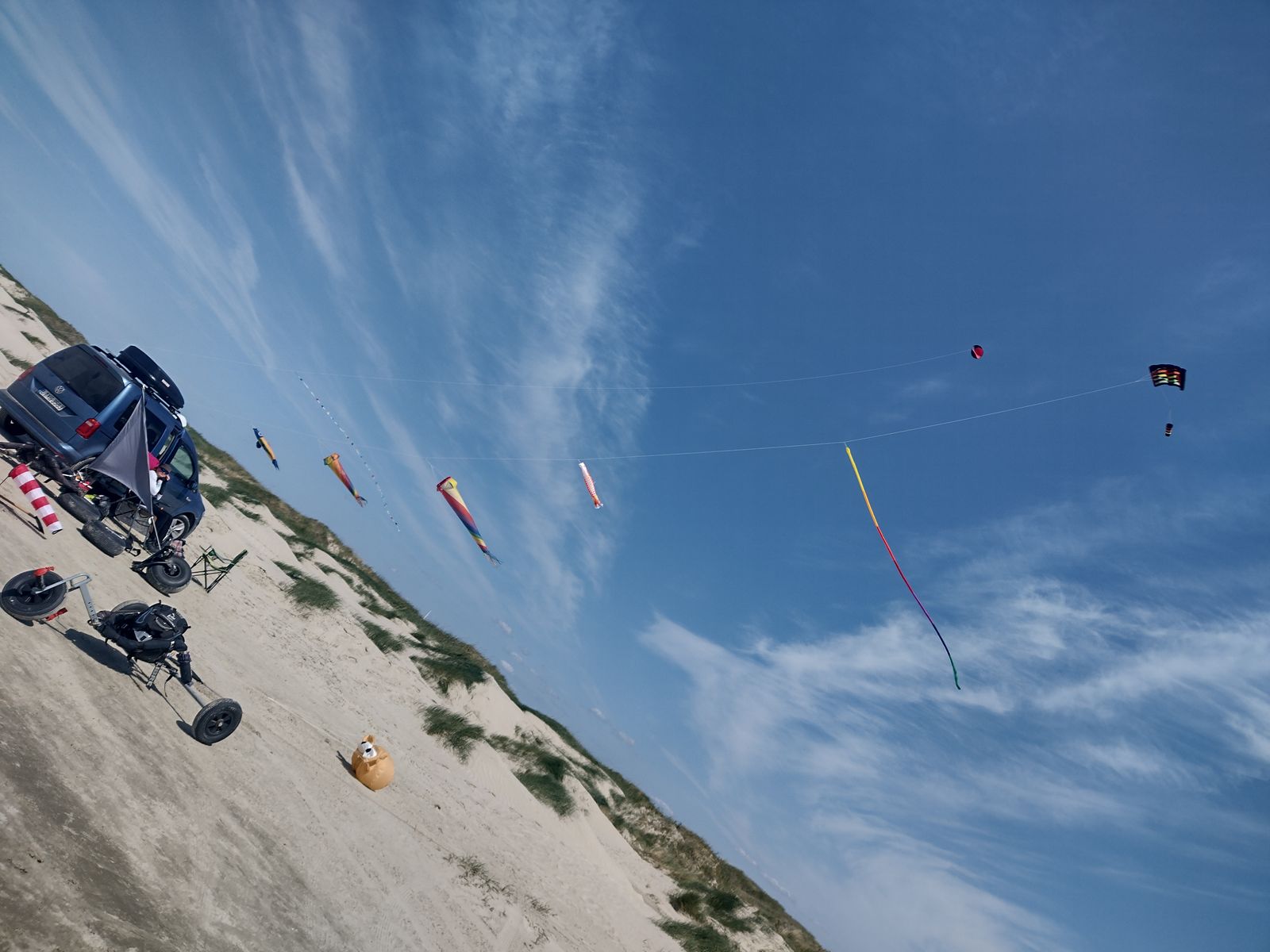 Ich war vom 27.5.-10.6. hauptsächlich zum Buggykiten mit Freundin, Hund und 2 Buggys auf der Insel, habe aber immer am Basiscamp an det Düne 1-2 Einleiner ( Switch und mittlerer Sled) mit Leinenschmuck stehen gehabt, und habe immer noch Abends nach dem Essen meist am Ferienhaus und 3 mal am Strand noch verschiedene Stabvierleiner geflogen, bzw.einmal die Smithi Pro.
