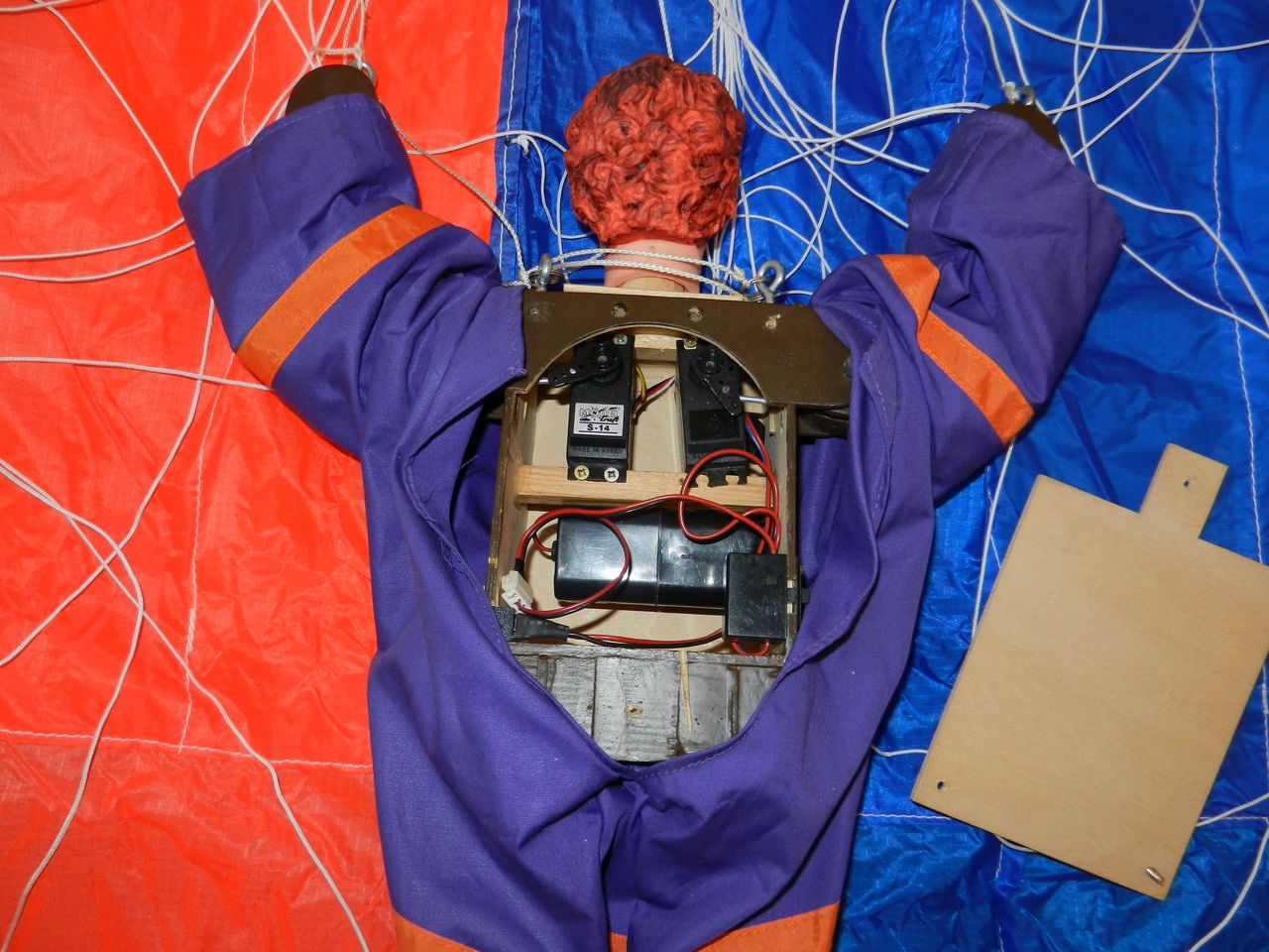 Genau über diesen Mechanismus brüte ich gerade, nur da sind einige Dinge zu Bedenken. Ein RC Springer wird "tot" nach oben gebracht, soll heißen: der Schirm ist gepackt im Packsack und ruht in der "DropBox" (Schachtel mit Auslöseeinrichtung) - somit wird der Springer mit Gummi in der Box gehalten; Gummi frei - Springer raus. Dann hängt der arme Kerl aber immer noch an der Box mit dem "SaftyPin" der mit einer Schnur an der Box befestigt ist (Elektronik wird erst scharf, wenn der Pin aus dem Springer gezogen wird), eine Sicherung um ein versehentliches Schirm öffnen zu vermeiden. Hier mal ein Technik Link. Auf dem Bild ist das gut zu sehen - rote Box (DropBox, darunter die Gummis und aus der Beschreibung bedingt eine gewisse Grundhöhe (will ja keinen Durchfaller) und der SaftyPin steckt dem Kerlchen im Popo ;) .