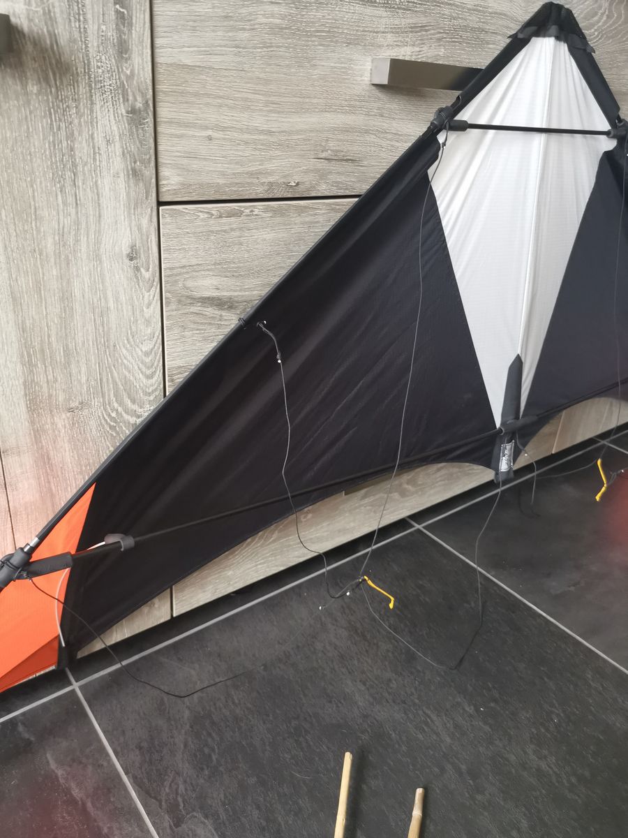 Die Segellatten (dünnes Carbon) scheinen das Segeltuch nicht stark genug zu spannen. Es ist nicht nur ein kleiner Lärm, den er macht, sondern er brüllt wie ein Bär, also überhaupt nicht gut. Dadurch ist er jetzt absolut nicht schnell, er kommt zum Beispiel nicht an meine HQ Whiz oder Spacedrachen Wilder Willy heran.