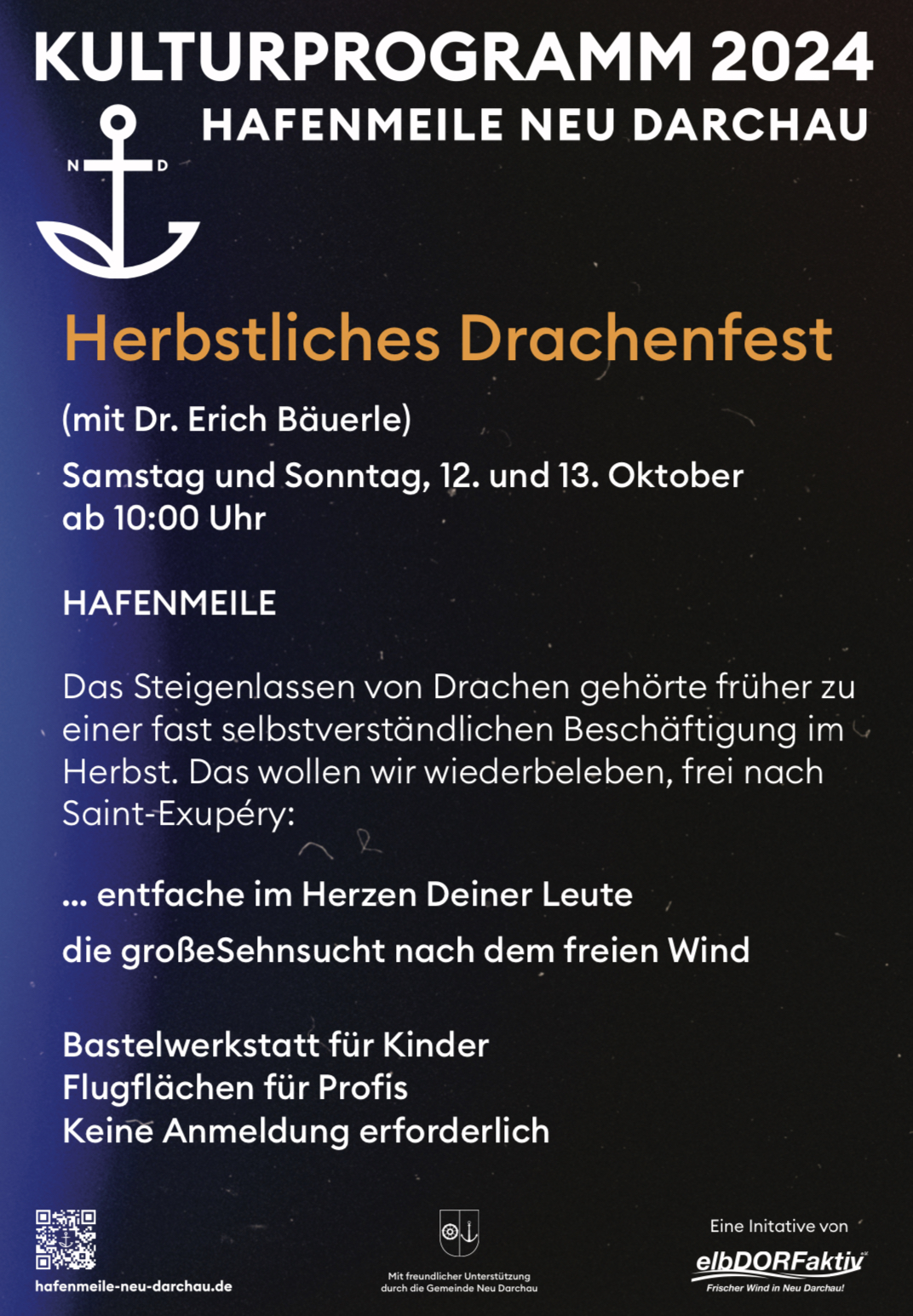 ZitatMoin, auch in diesem Jahr findet das kleine, feine Drachenfest an der Elbfähre statt (Niedersächsische Elbseite. Flugflächen und Parkplätze sind ausreichend vorhanden. Falls ihr Fragen habt oder euch anmelden wollt: Erich.Baeuerle@t-online.de