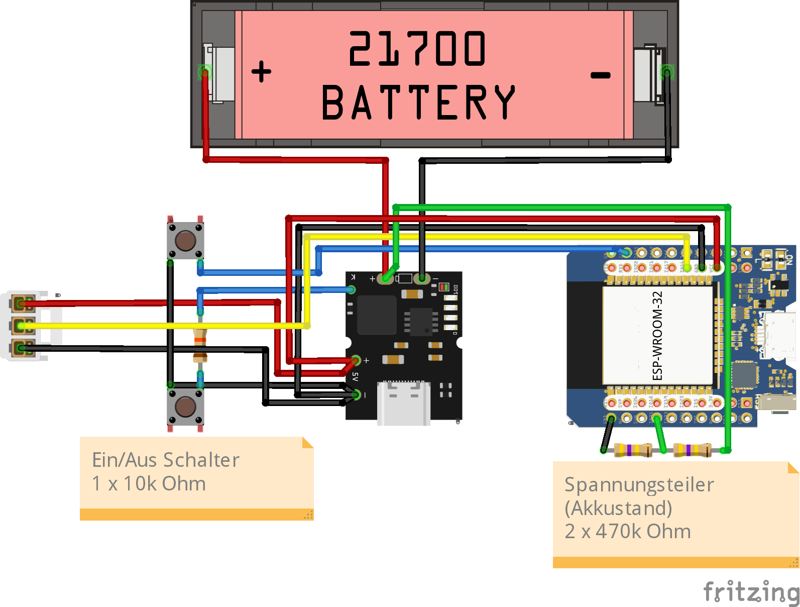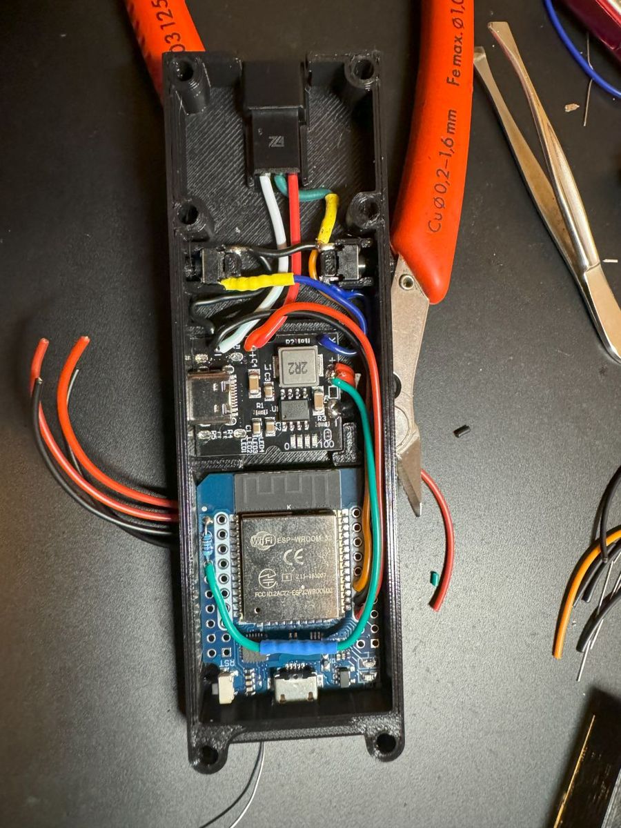 In dem Controller sind ein 5000mAh Lipo Akku, ein 5V 2A Boost Converter mit Ladefunktion und integrierter Akku-Schutzplatine und ein ESP32 Microcontroller verbaut. Es gibt noch 2 Taster, einen zum ein- und ausschalten und einen frei belegbaren.