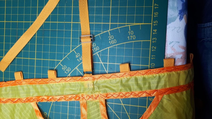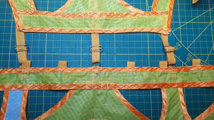Ich habe endlich die Verstärkungen an den Segelenden mit den Spannschlaufen für die Querstäbe fertig bekommen und die Querstäbe gebaut und eingefädelt.