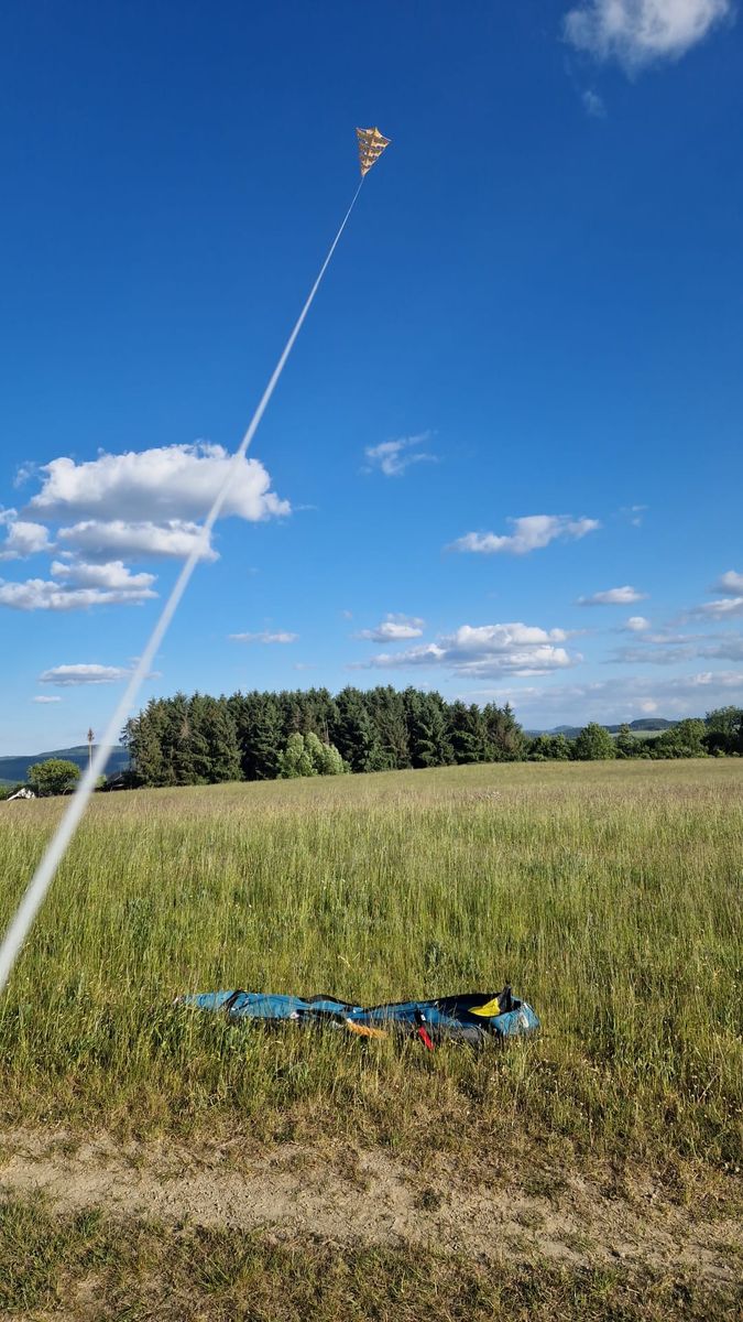 Aber ich hatte Glück und die Waag stimmte. der Brogden zog direkt nach oben. Gut er tendierte leicht nach links zu fliegen. Dann die Bänder des oberen Segels auf der linken Seite etwas bachgetrimmt. Jetzt flog er stabil am Himmel.
