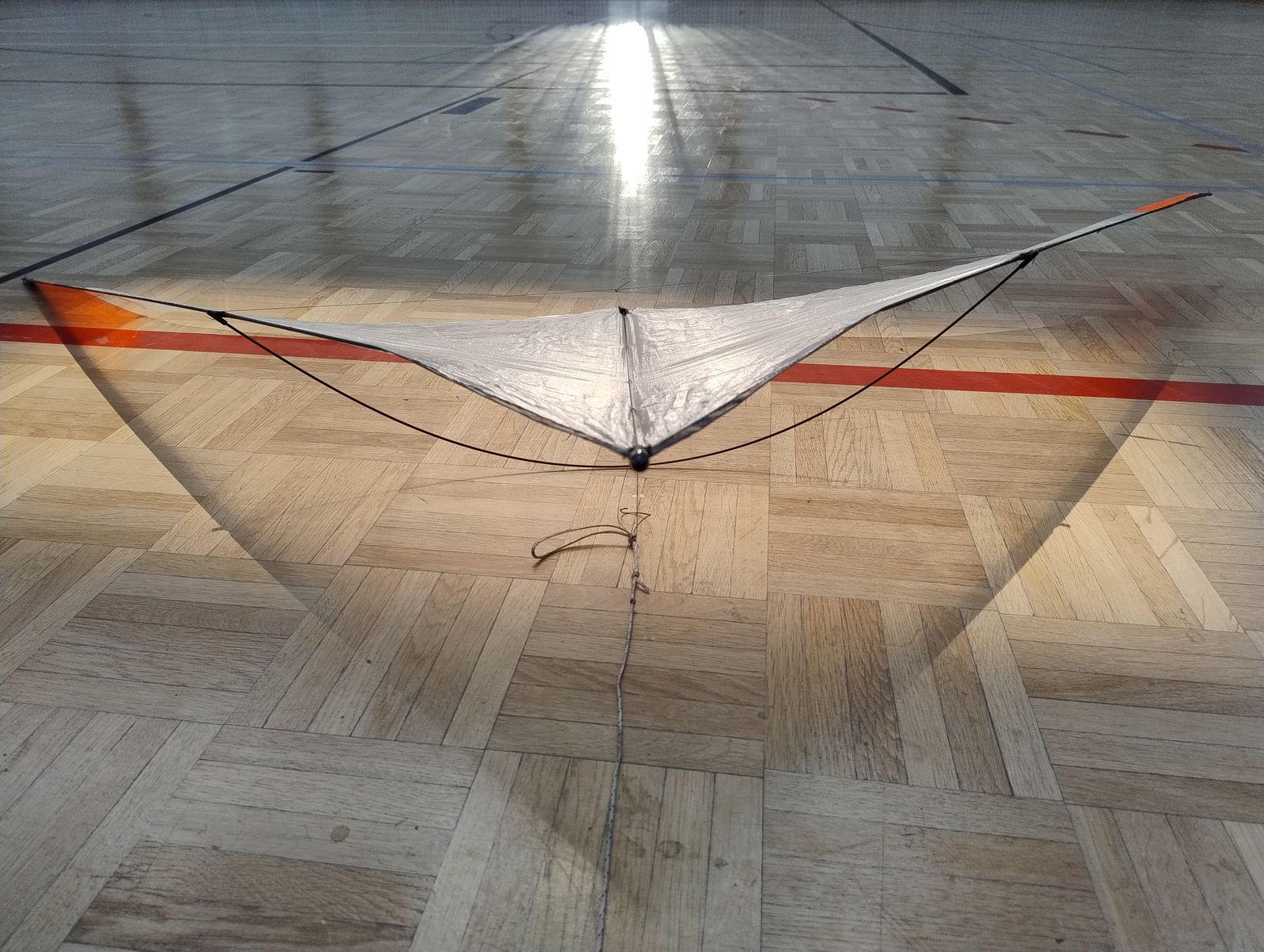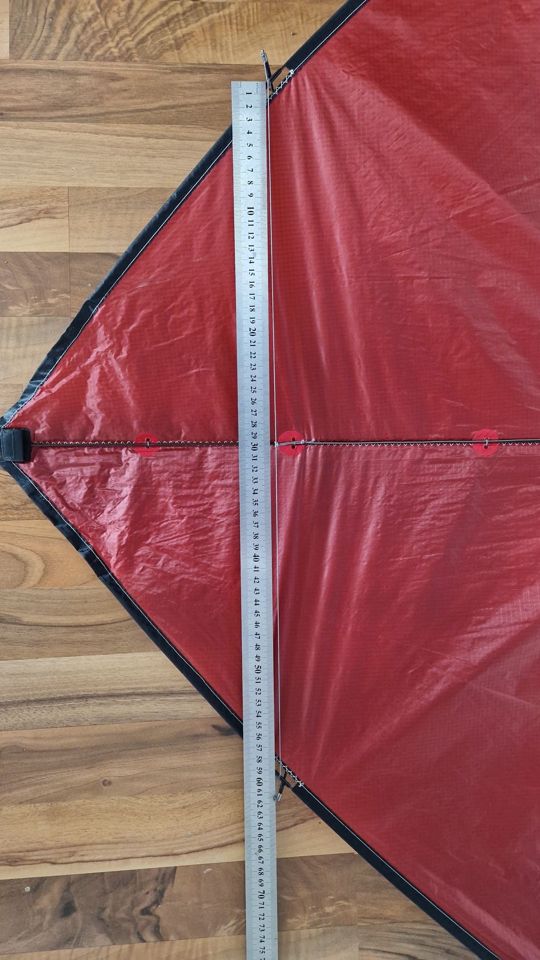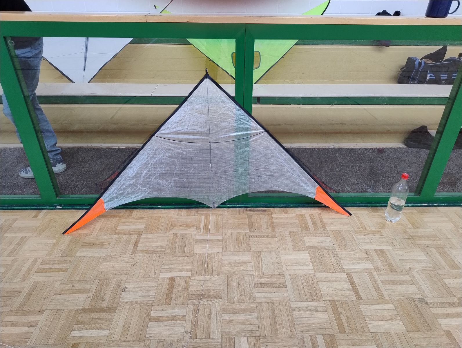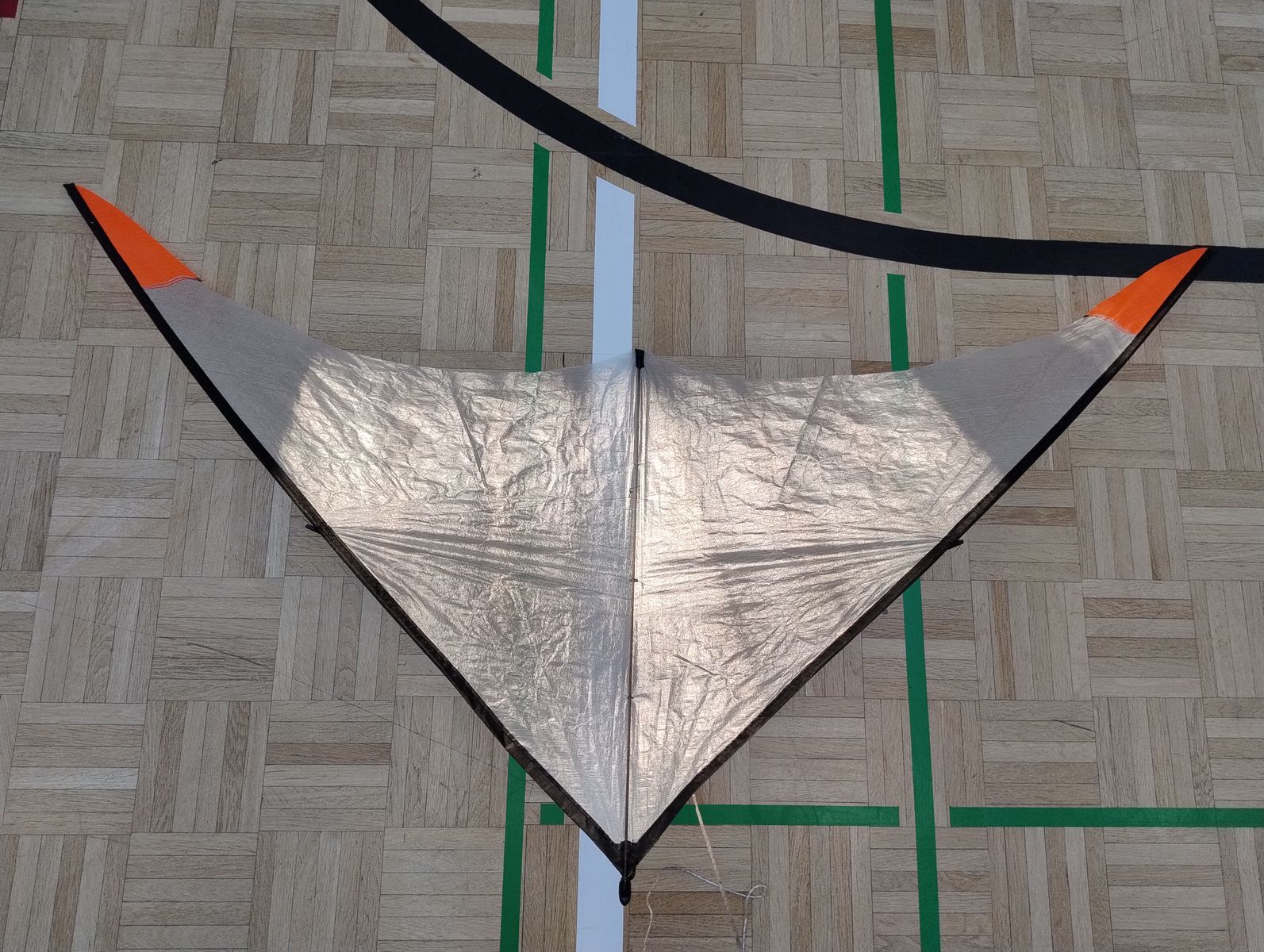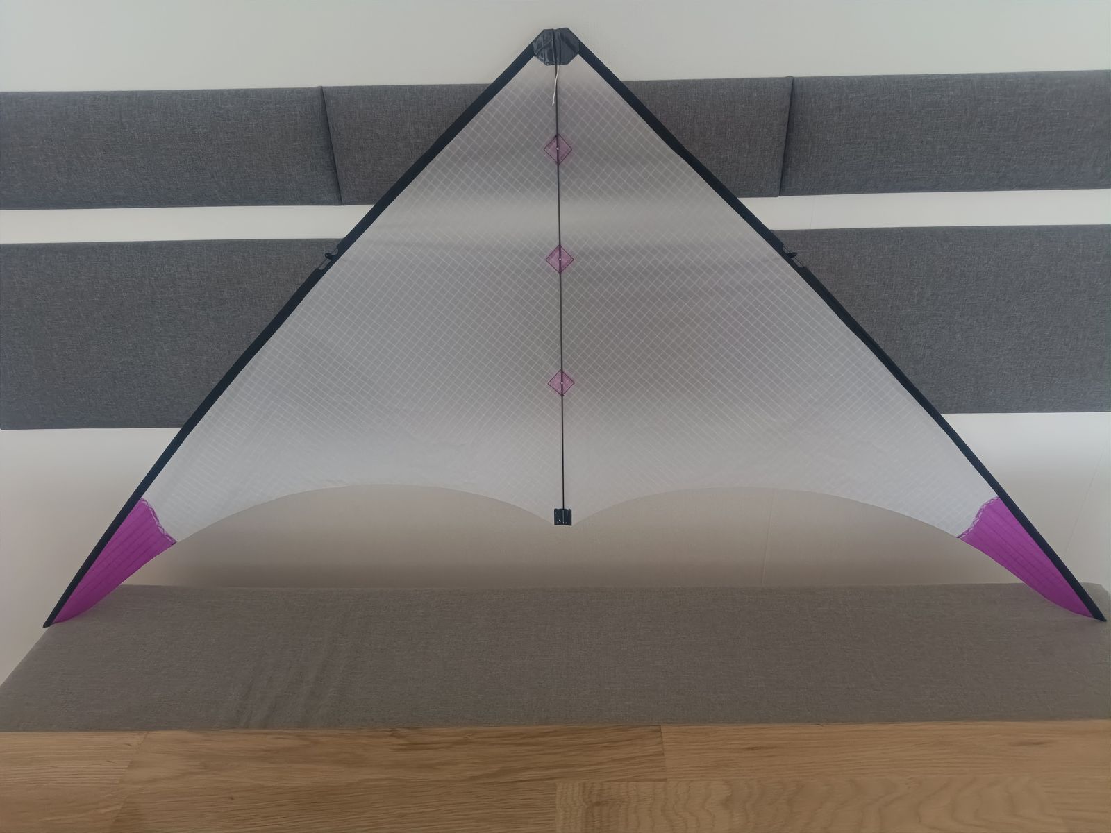 Getrimmt wird nur über die Kappen oben am Kielstab und ein Vorfach in der Flugschnur. Das reicht bei 24g aus.