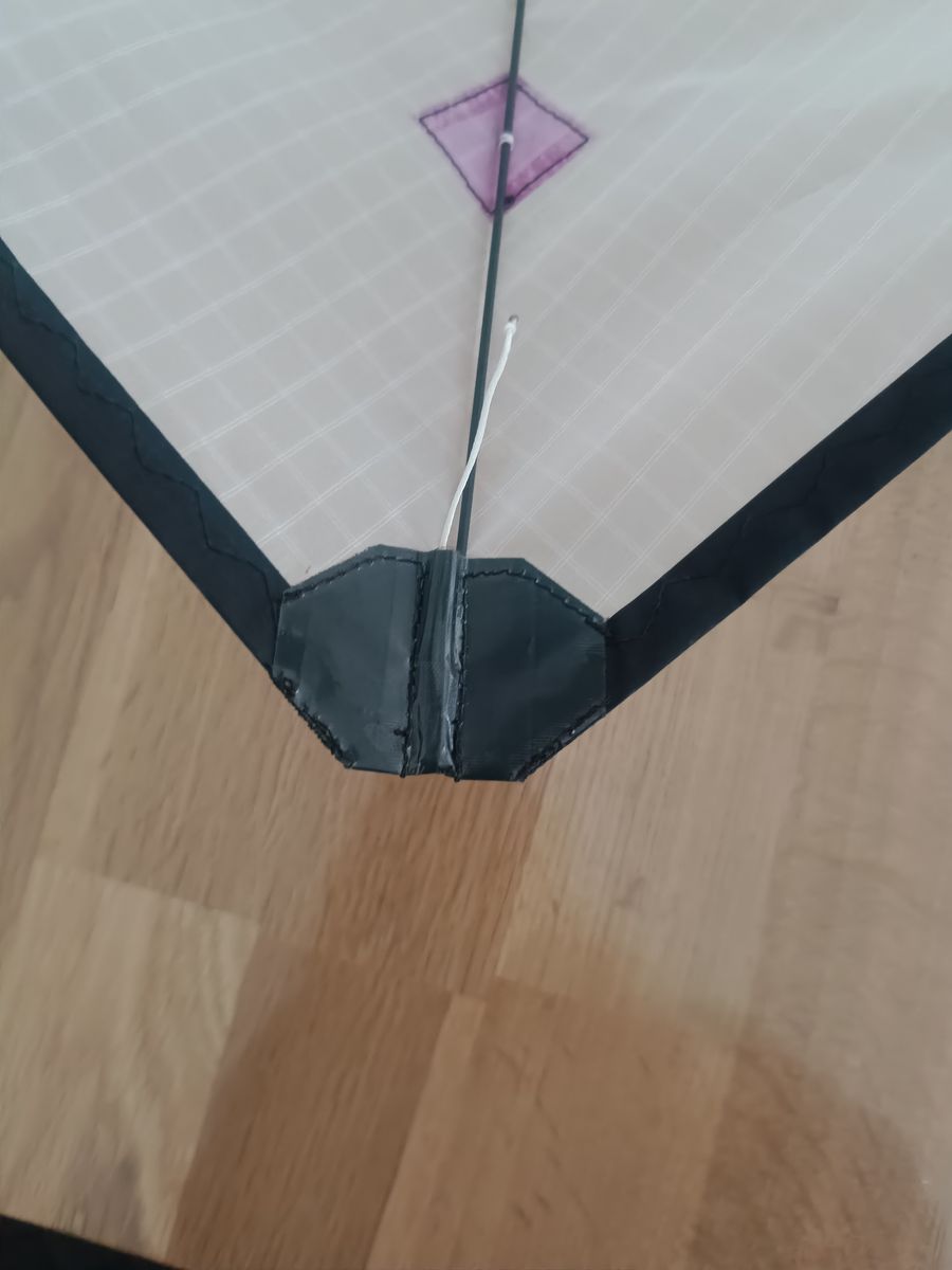 - Endkappe locker aufgesteckt und mit Waageschnur befestigt, dabei das Segel leicht gespannt