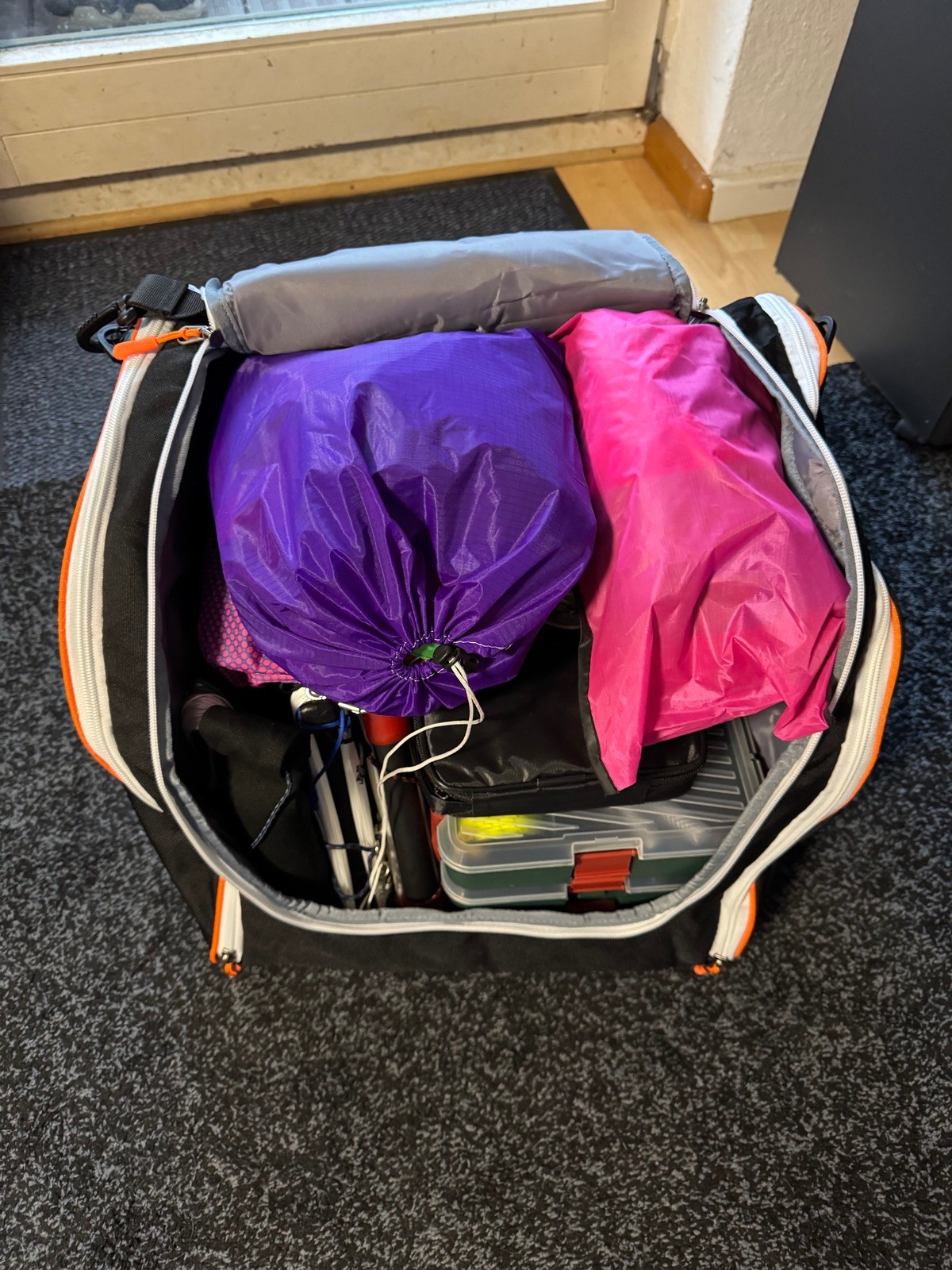 • Ich habe für den Zweck eine Snowboardtasche. Die ist etwas breiter als eine Skitasche, so dass Haspeln, ne Matte und ein Dreibeinhocker besser mit reinpassen. Ist viel billiger als ne echte Drachentasche