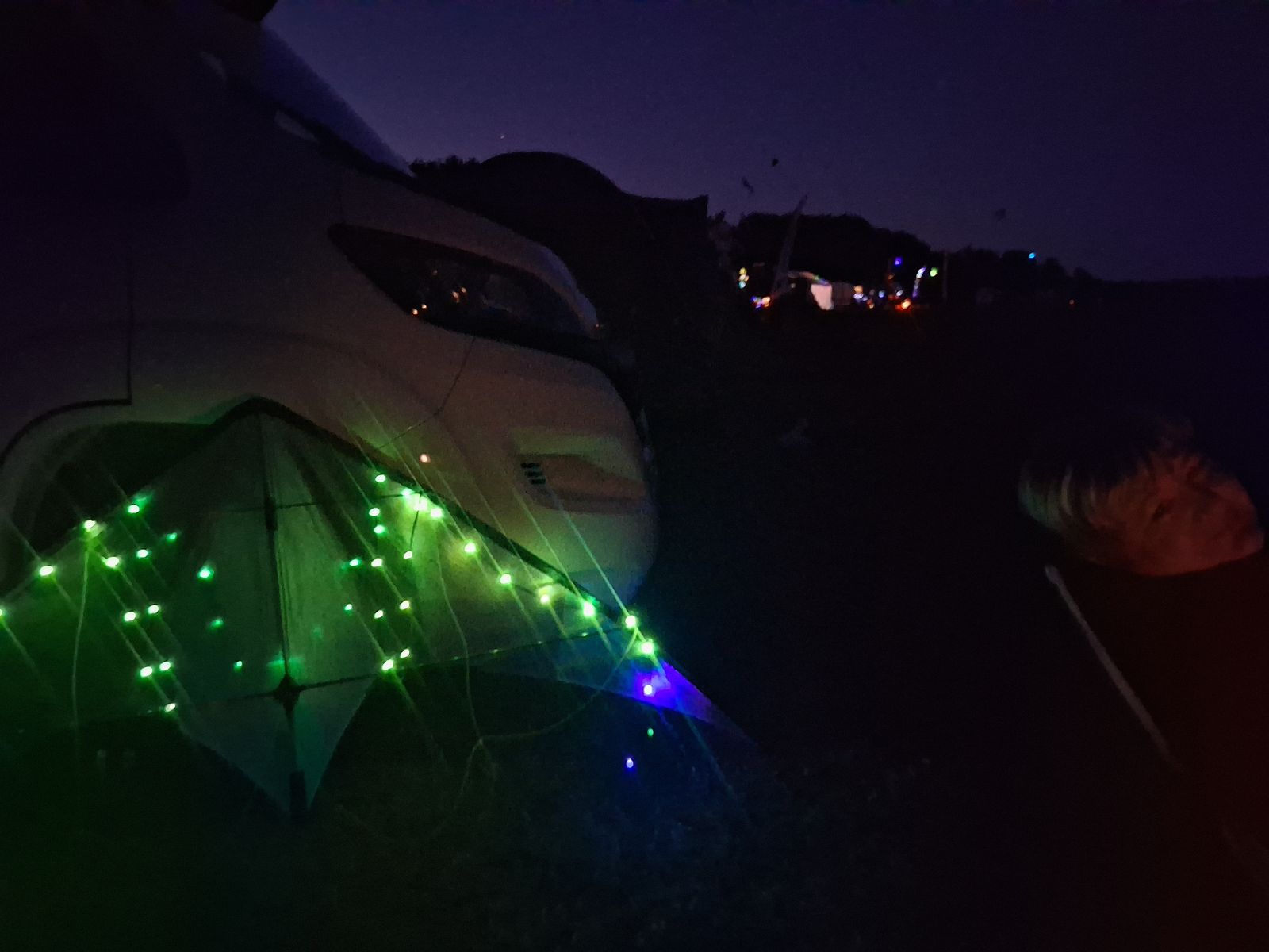 Ich habe Freitag und Samstag beim Wiesentreffen des DC rtf Wittenberg in Ferropolis die Beleuchtung provisorisch angebracht und getestet, Samstag dann bei Hauchwind mit dem Proto vom Shade.