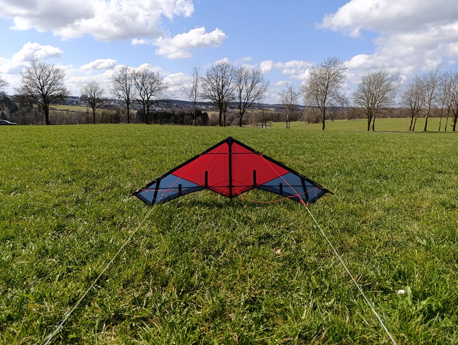 Die erste Ausführung war mit Standoffs versehen, bremste aber durch die Konstruktion des Kiels, die Ausdehnung des Segels aus, was sich durch starke Flattergeräusche bemerkbar machte. Als ich die Standoffs entfernte war das Flattern weg ! Jetzt brauchte ich nur noch einen Testflug bei kräftigerem Wind.
