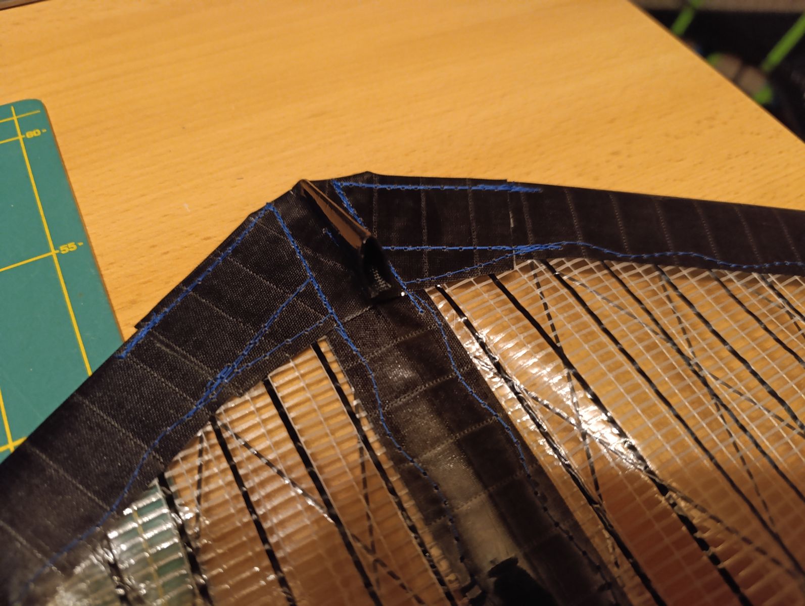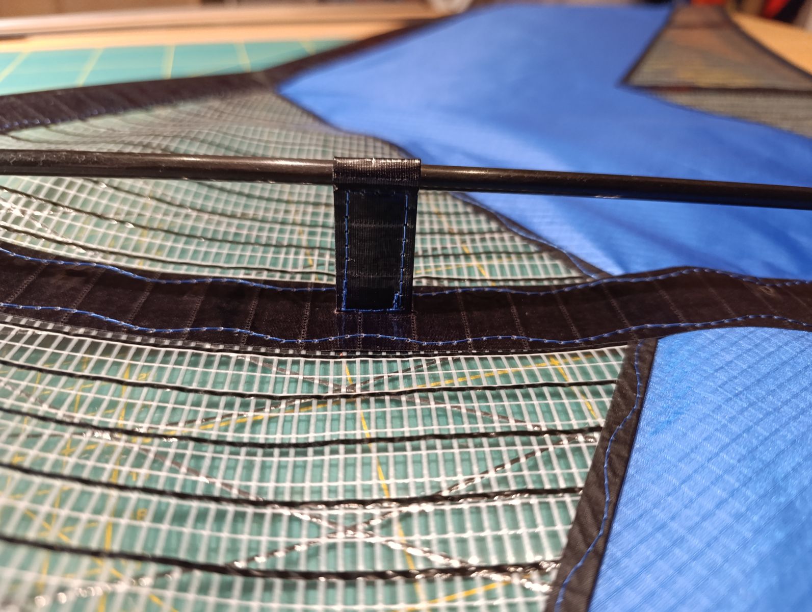 Anstatt eines Standoffhalter, habe ich mir den Steg, indem ich ein Flachcarbon eingenäht habe, selbst genäht. Somit halte ich den nötigen Abstand für die Vorprofilierung und gleichzeitig wird eine zu weite Ausdehnung verhindert. In die Rückseite habe ich lediglich einen 3er GFK eingeschoben.
