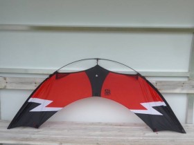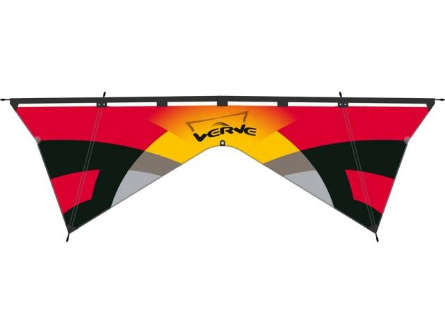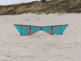 Der Drache hat eine geteilte Leitkante und wird nur durch den Bogenstab aufgespannt. Er ist etwas quirliger als andere 4-leiner und als Trickdrache konzipiert.