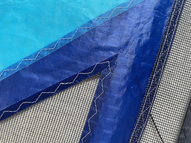 Ich habe mich immer geärgert über meine "alten" Ventilierungen aus Gaze, die mit Tape hinter die Ausschnitte geklebt waren. Sie wurden über die Jahre immer dreckig, vor allem durch Sand am Meer.Seit einiger Zeit klebe ich den Klebestreifen zusätzlich mit einem selbst hergestellten Streifen aus Icarex ab. Das geht natürlich nur mit geraden Schnitten. Hier ein Bild dazu