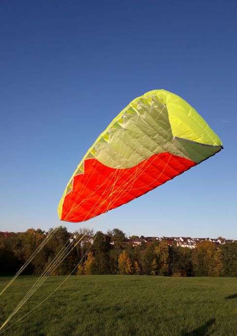 Wenn ich die Bremsleinen durchhängen ließ, so waren die Flugeigenschaften der 28+ wie zuvor als 2-Leiner. Wichtig ist, das die Bremsleinen im nicht betätigten Zustand gut durchhängen, auch sollten sie nicht zu schwer sein. Ich hatte Steuerleinen 30m / 130daN und Bremsleinen 30m / 70daN gewählt. Das passte prima (bis obere 5 bft).