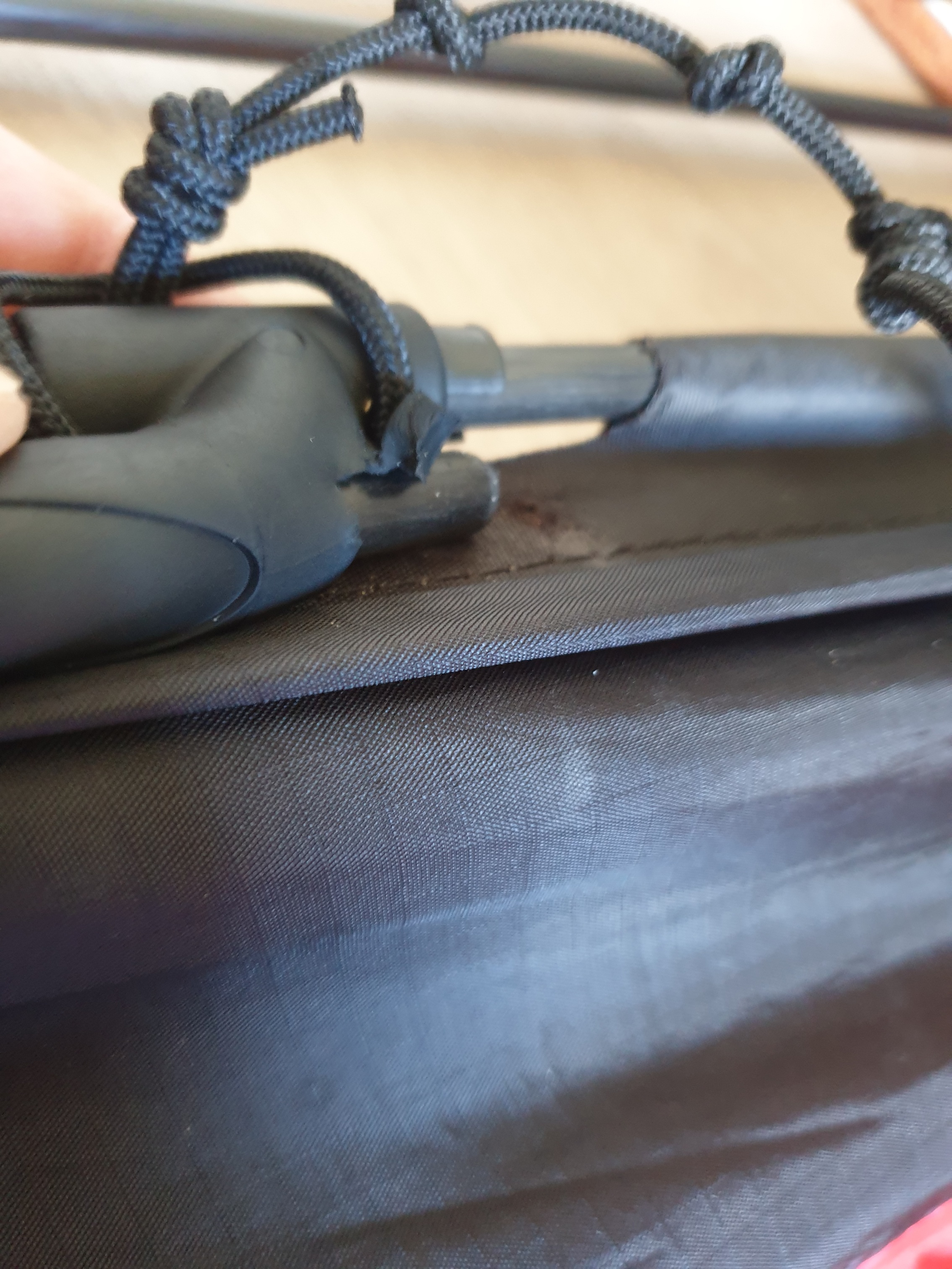 Erstes Thema ist die Befestigung der Saumschnur. Diese soll wohl ums T-Stück gewickelt werden und dann mit dem Klettband eingeklemmt werden.