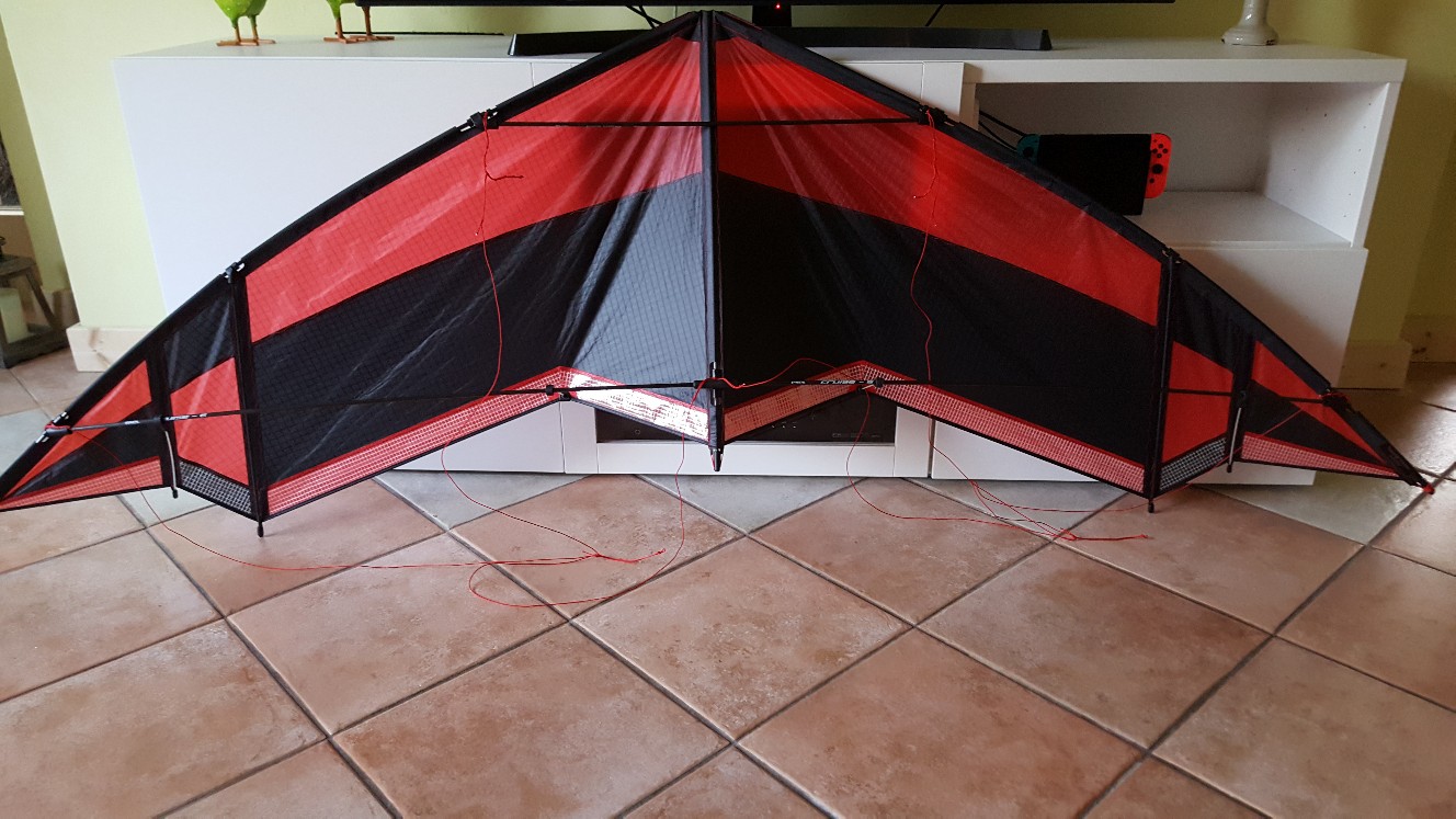 Zunächst wäre da der Destroyer von Drachenbau Benning aus dem Jahr 1996. Top in Schuss, ich hatte ihn ganz kurz bei Gewitterböen in der Luft, fliegt leise und schon mal sehr ansprechend. Dieser Kite hatte es mir in der Anzeige angetan und er sieht auch in Natura großartig aus. Spannweite 325 cm, Standhöhe 130 cm.
