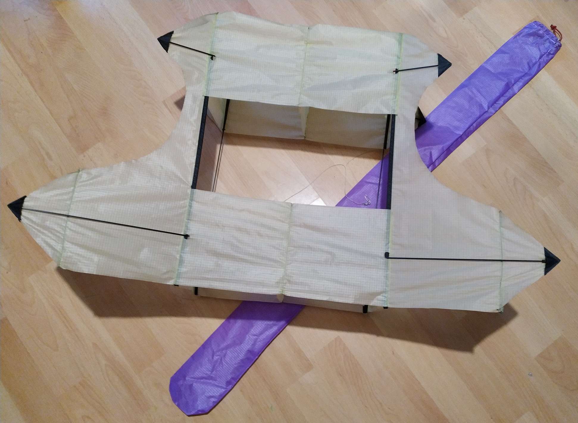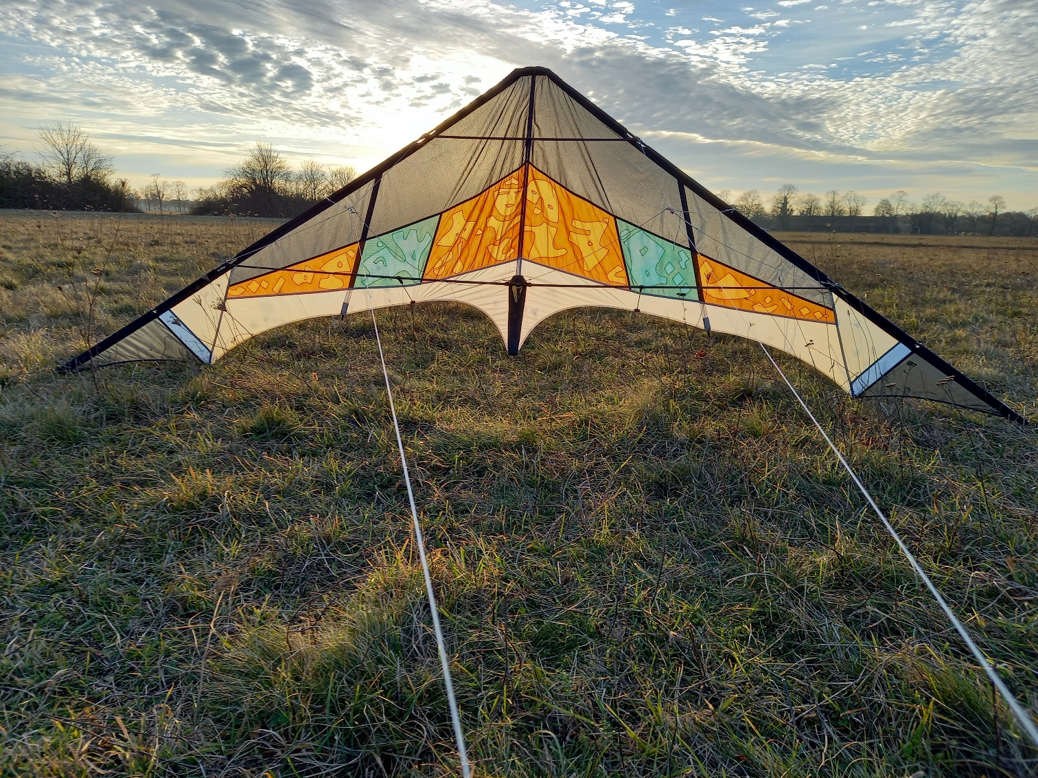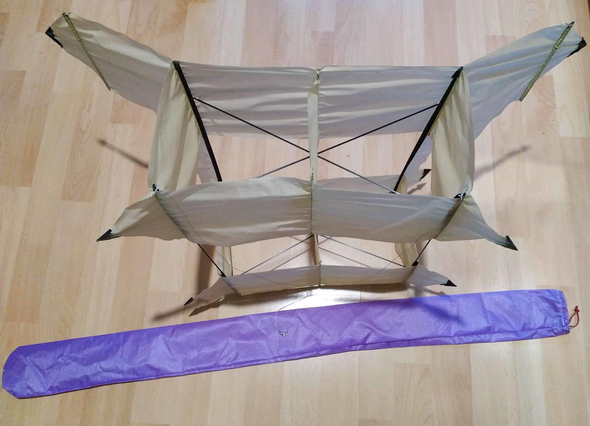 Der Drachen hat zu Hause auf der Wiese ein bleibendes Grinsen in mein Gesicht gezaubert und eine gute halbe Stunde erstaunlich stabilen Flug bei relativ böigem Wind abgeliefert.
