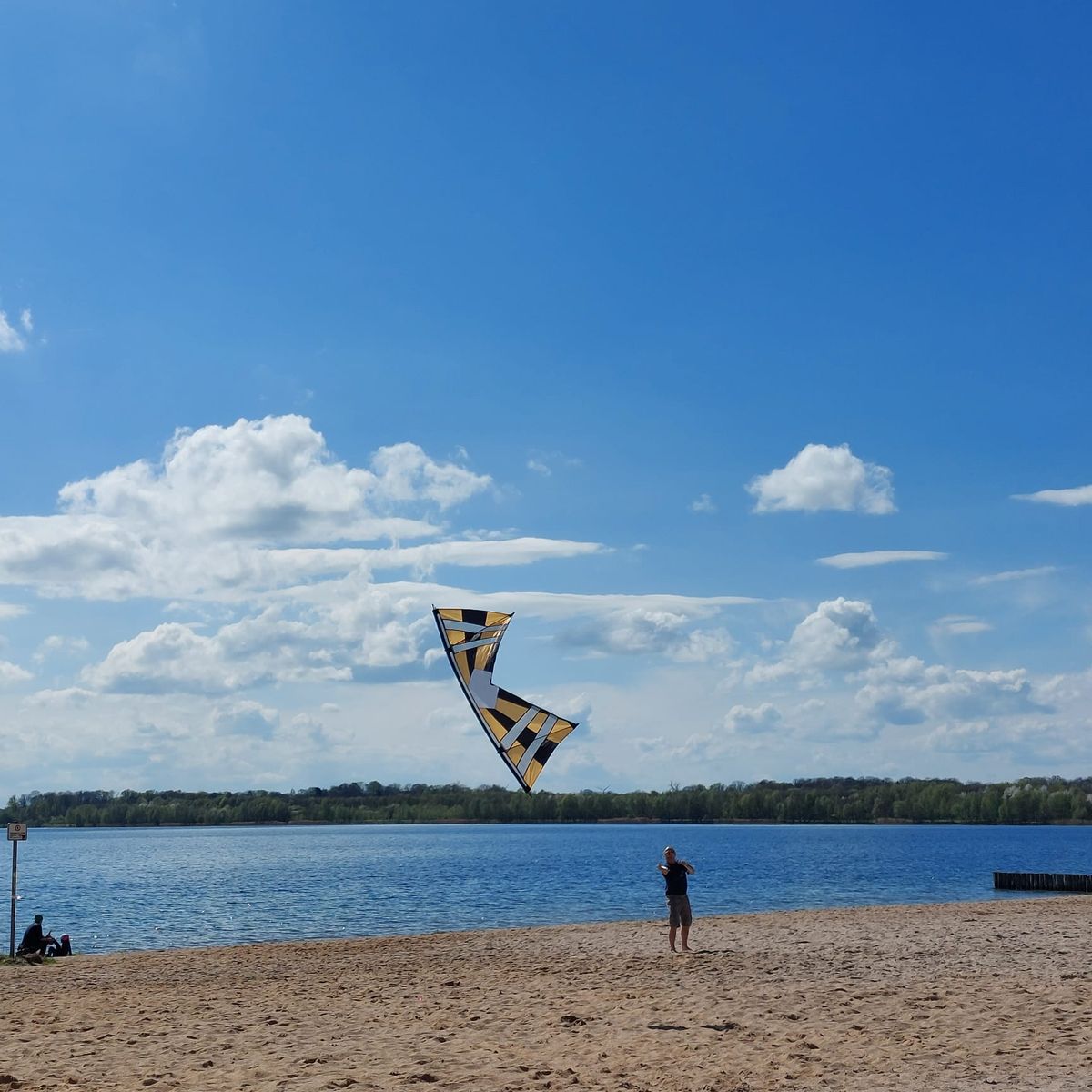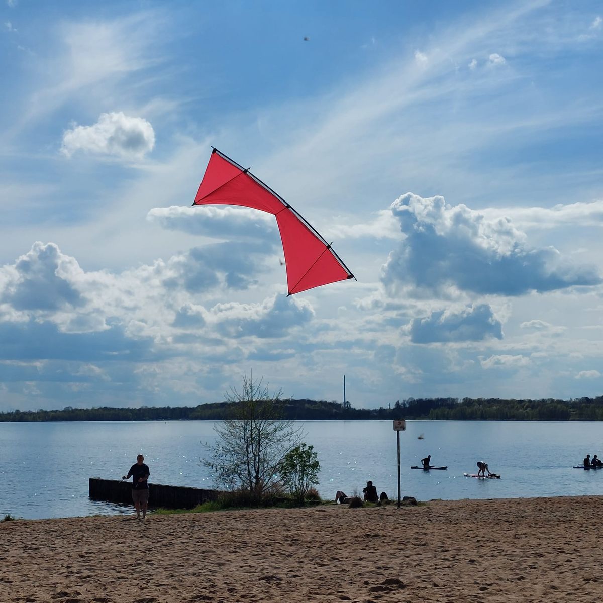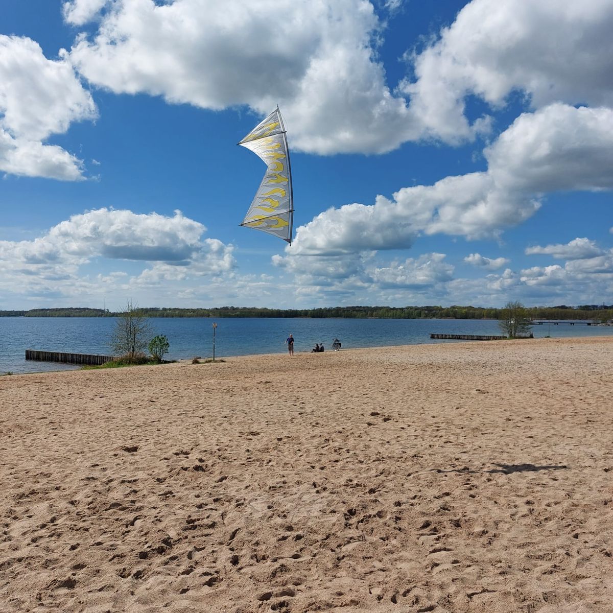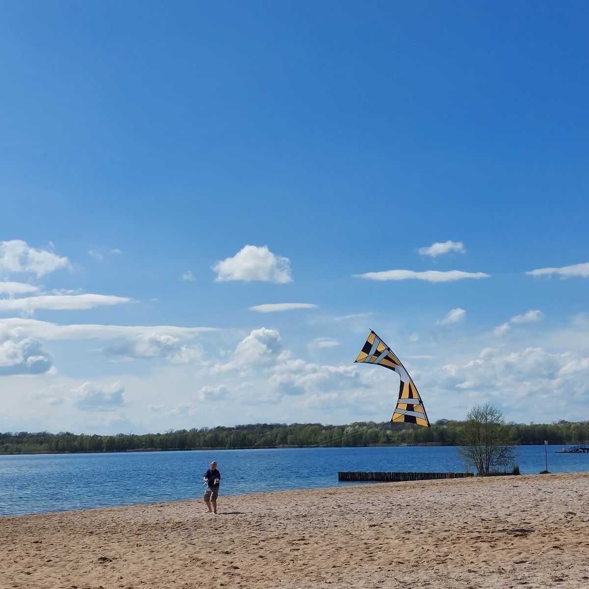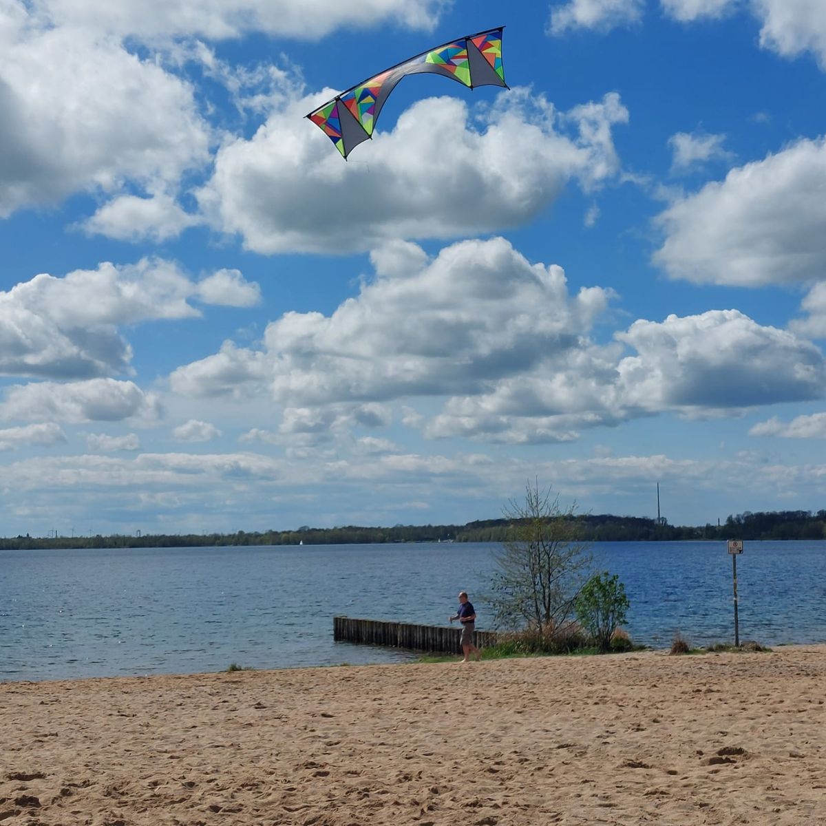 Heute mit Freundin und Ihrem Hund bei Kaiserwetter und durchwachsenem Wind 4 Leinerstabdrachenfliegen am Nordstrand Cospudener See. Am Anfang so ca. 8-10, am Ende eher 3-4 kn.
