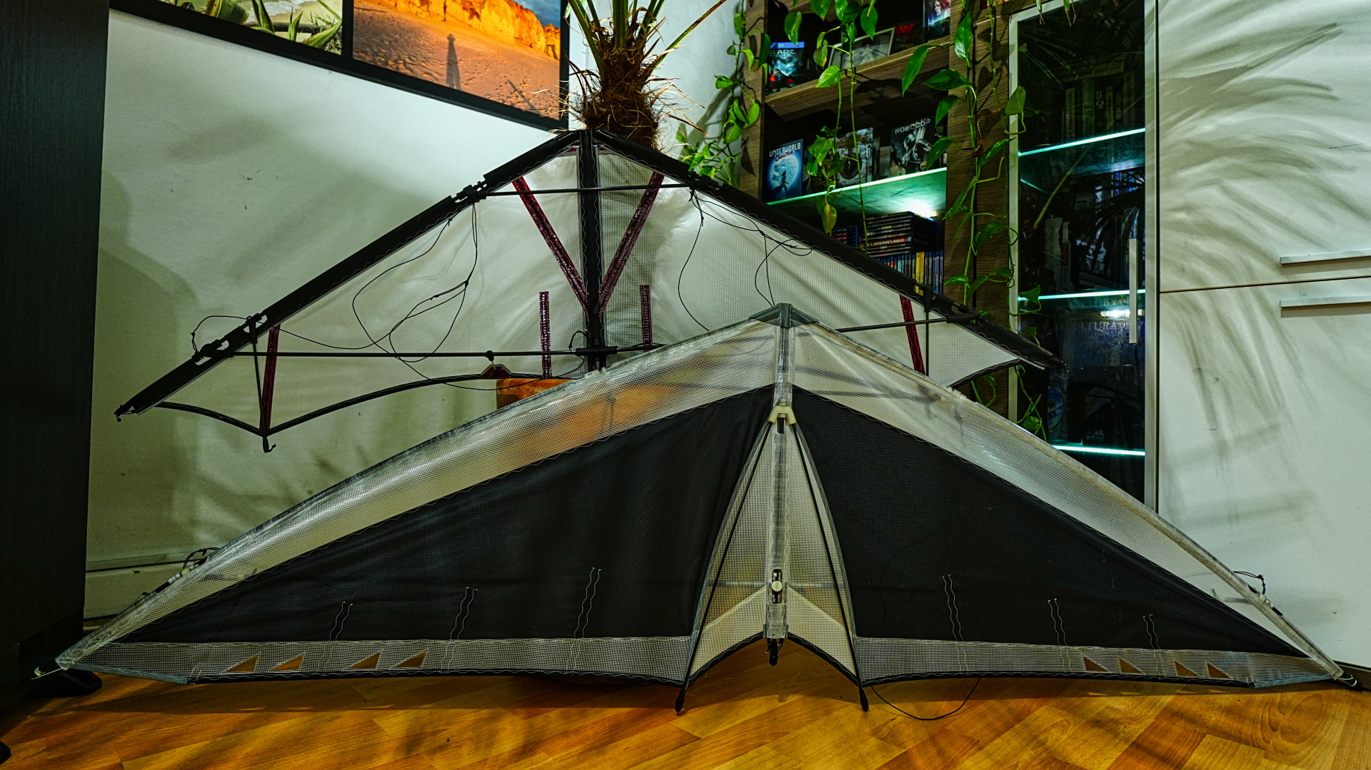 Im Gespräch über den kaum vorhandenen Wind im Binnenland wurde dann erwähnt, dass noch aus Teamflugzeiten des Ladens ein unbenutzter Ersatzdrachen aufgetaucht ist. Gesehen und gekauft.