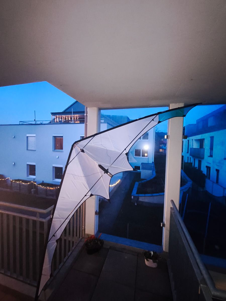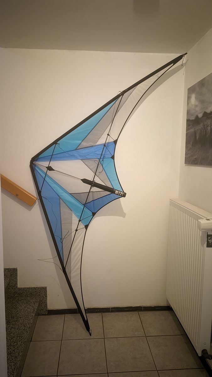 Der grösste Unterschied ( abgesehen von der Farbcombi) zum Proto, den ich seit ca. 4 Jahren besitze, sind die geteilten Leitkanten, so das das Packmass gefaltet 80cm beträgt. Ausserdem " bloss" noch 3 Knoten zum steiler oder flacher stellen ( beim Proto 6) , aber den obersten und untersten habe ich beim Proto nicht benutzt, weil der dann schlecht fliegt, und einer mehr oder weniger wird egal sein. Bin gespannt auf den Erstflug.