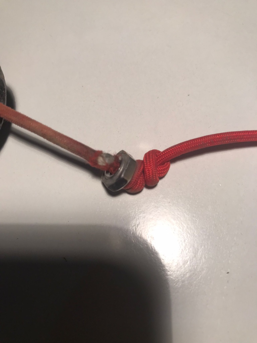 Alten Tampen und Metallring und Karabinerhaken raus 2 Löcher Bohren neuen Tampen ran fertig.