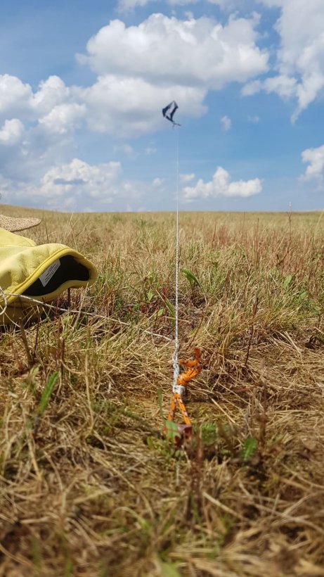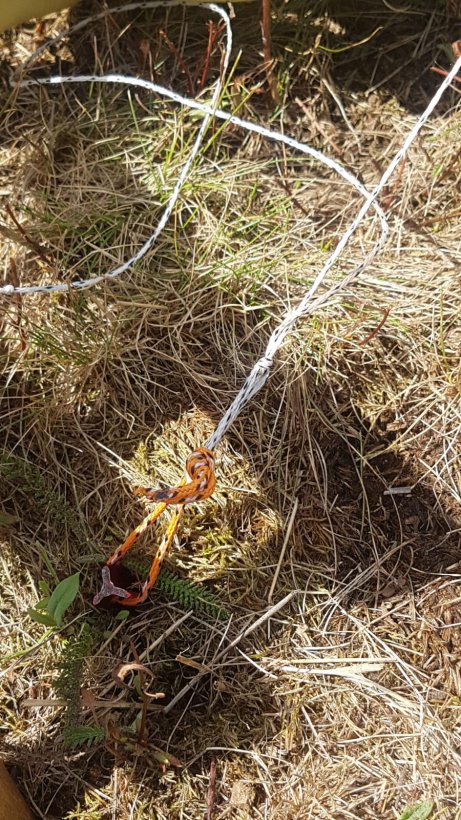 Ich selber habe jetzt zwei 40cm Erdanker, wie weiter vorne im Thread gezeigt, nebeneinander genommen. An diesen habe ich je eine stabile Handschlaufe angelegt und diese beiden wiederum mit einem Karabiner verbunden. Am Karabiner selber habe ich dann mit einem Buchtknoten befestigt. Der Untergrund ist eine normale Wiese.