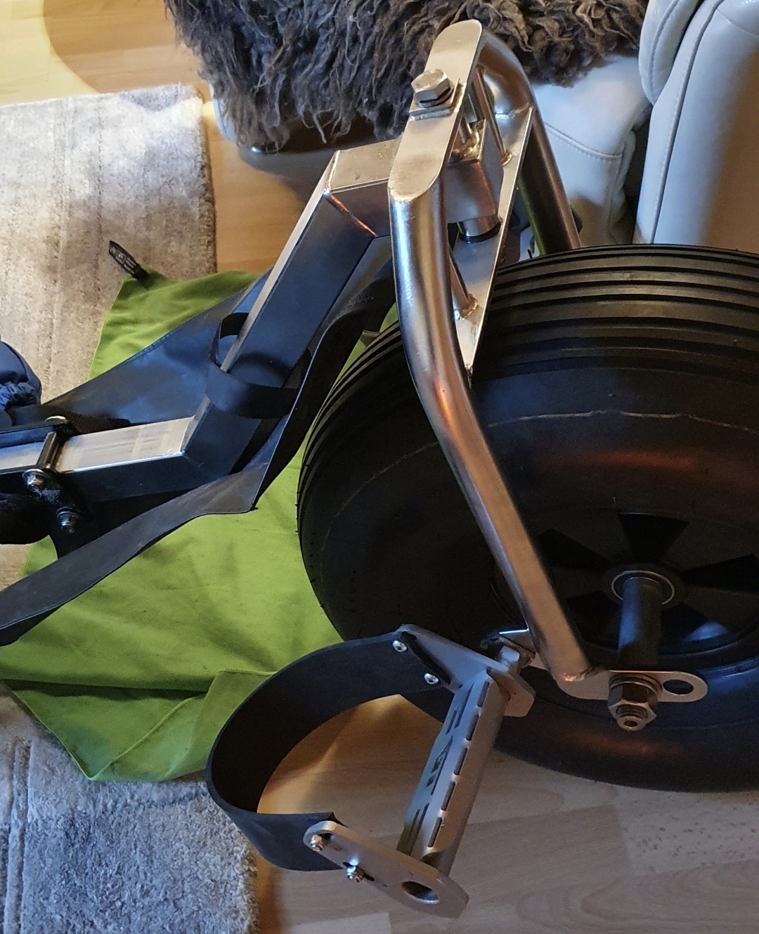 2. Die Fussrasten bzw. Hackenschlaufen so drehen, dass die Fersen gemütlich aufliegen. So, wie die jetzt montiert sind, kann man drin hängen bleiben. Ergänzend die Länge des Buggys entsprechend einstellen (länger als mit normalen Rasten).creeds