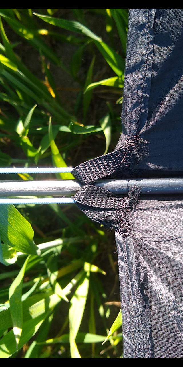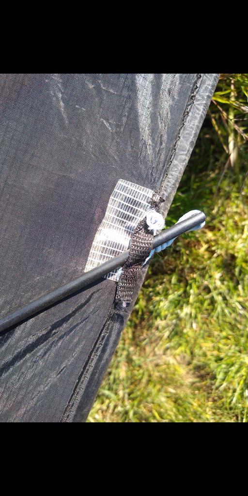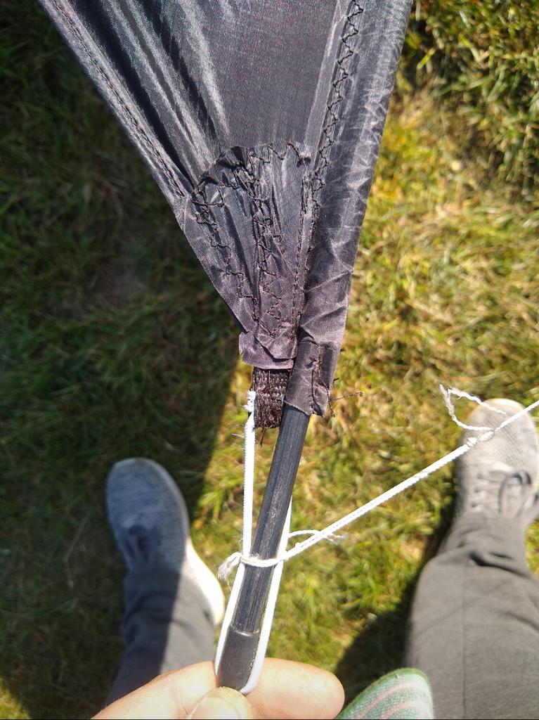ich habe jetzt einen ring geknotet und diesen paarmal um den stab...glaube das nennnt sich prusik oder so...hält scheinbar...leider grade totale flaute ..aber scjon beim laufen steigt das teil sofort und wenn man stoppt geht sie sofort ins gleiten über sieht echt toll aus in der luft..und groooosss....