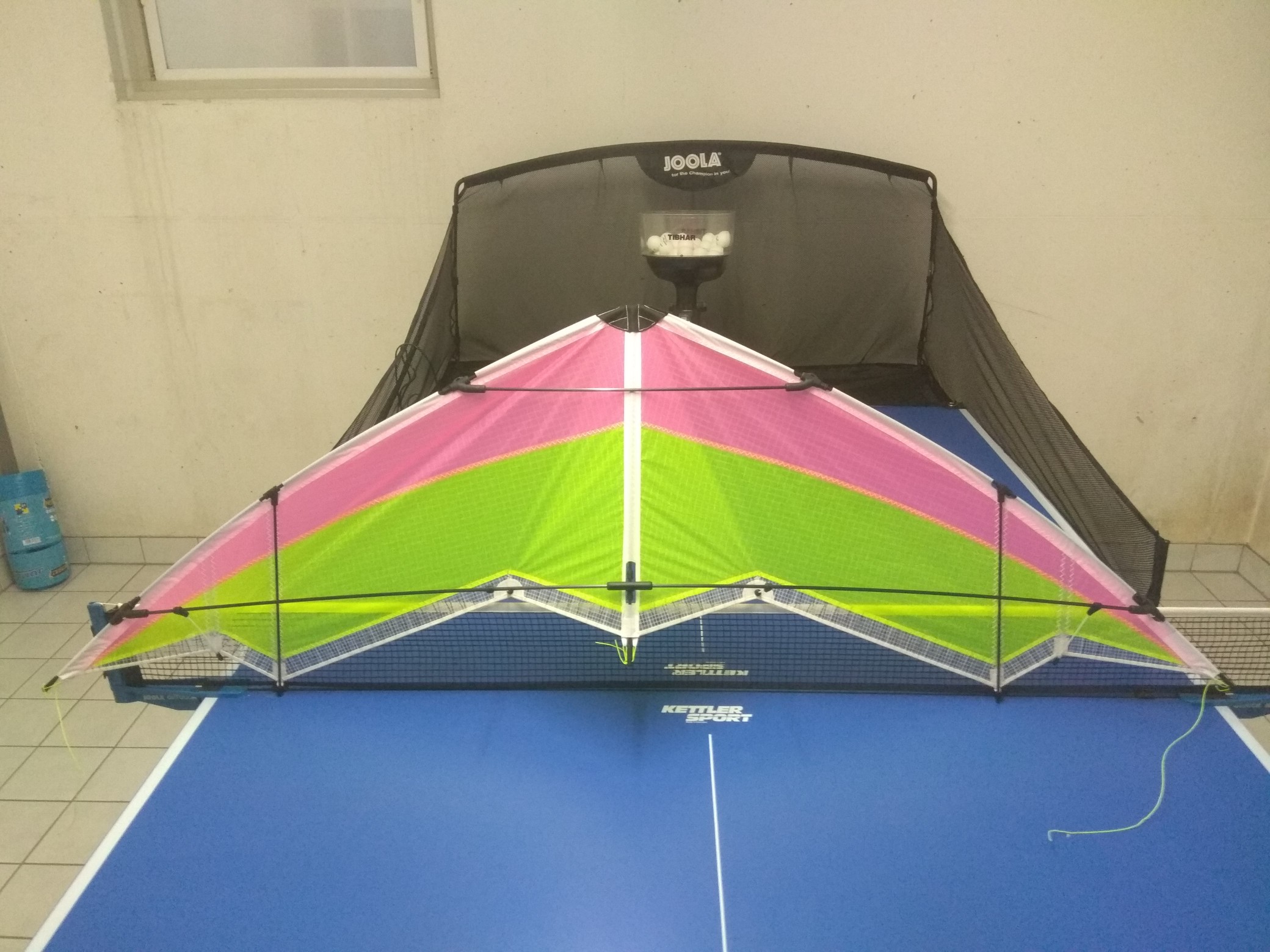 Als nächtes ist dann Bernds neuestes Werk gleich mit nach Hause zu mir gefahren. Lt. Aussagen eines erfahrenen Piloten, der Ihn schon geflogen ist, soll er super gut fliegen und einen normalen Rev in die Tasche stecken. Sein Plan war was leichtes (165gr das Tuch) für mich zu bauen (wegen Binnenlandflieger), was schon bei ganz wenig Wind gehen soll. Mein Plan war, mal andere Farben in meine Tasche zu bekommen und was auffälliges zu haben. Beides ist wohl aufgegangen...
