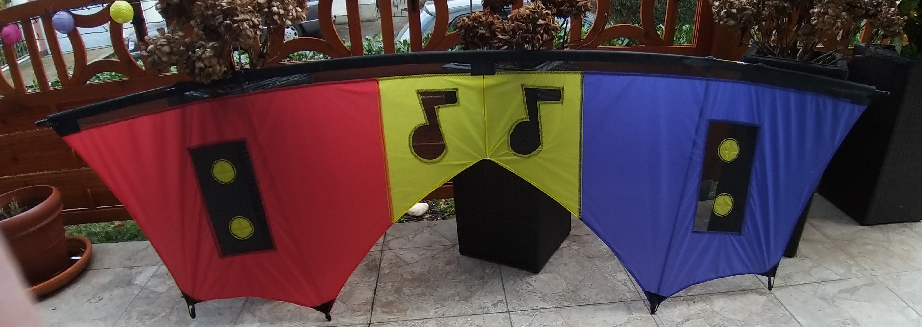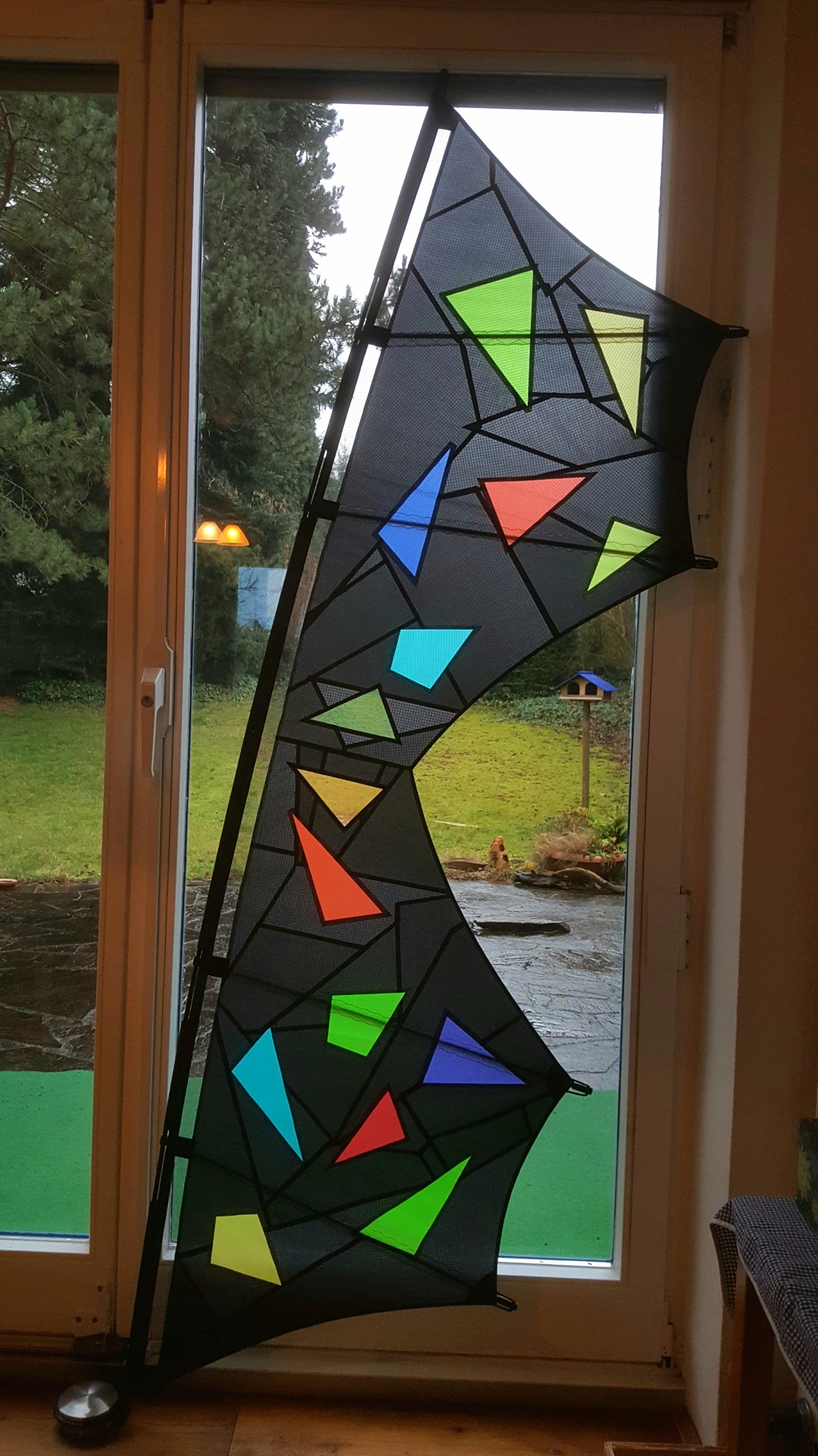 Die patriotische Idee stand eigentlich nicht im Vordergrund, das war eher Zufall. Ich hatte zum üben erstmal blau, gelb, rot und etwas schwarz gekauft und habe das für möglichst gerade Nähte vermengt. Mein zweites Übungsegel könnte man für die Rumänische Flagge halten wie ich hinterher erfuhr.