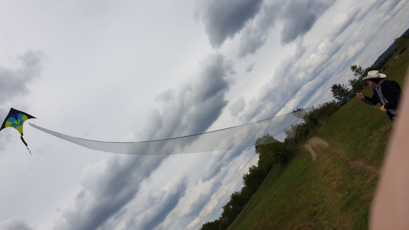 Ich habe mir eine Leinenfahne gebaut und heute schonmal die oberen 20 Meter der insgesamt 40 Meter langen Fahne getestet.Sie ist aus einem silbernen Organza und die unterste Breite ist 1,4 Meter und oben nach 40 Meter sinds noch 20 cm. Heute die oberen 20 Meter geflogen. Von 75 cm auf 20 cm. 2 Hälften deshalb, dass ich die Fahne auch dem Wind anpassen kann.