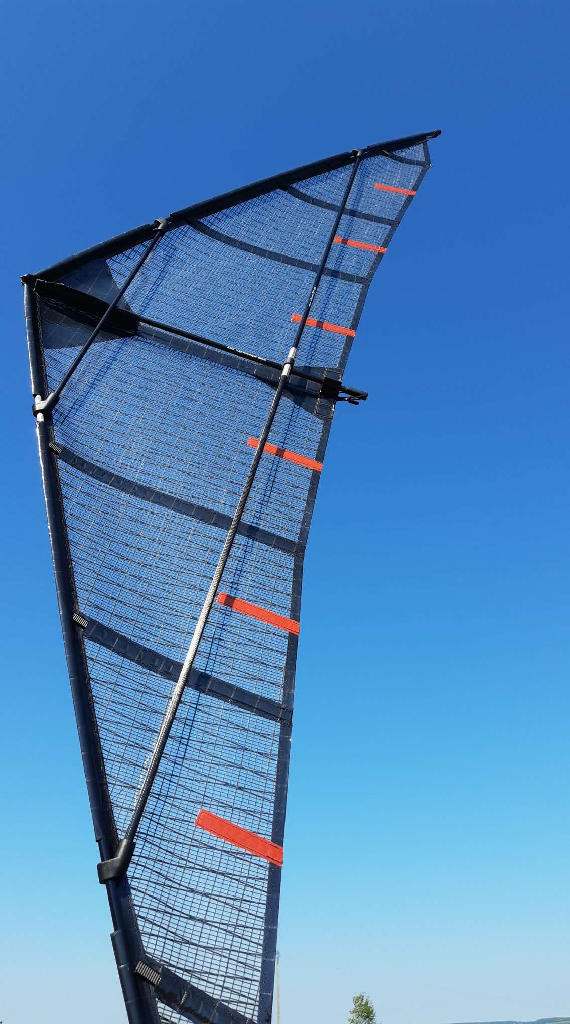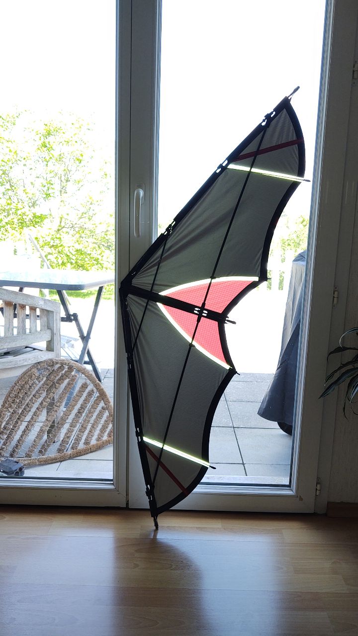 Bei meinen anderen Kites mit gleicher Lösung habe ich hinten ein Teil CFK, dann kommt ein Teil GFK und dann wieder CFK. Etwas ähnliches kann ich dem Flügel hier auch noch verpassen für stärkeren Wind. Der Stab hinten kann dann getrennt abgespannt werden und je nachdem wie fest man ihn abspannt zieht man das Profil flacher oder gibt halt Profil dazu.Der Tsunami hat ne andere Kielstablösung.