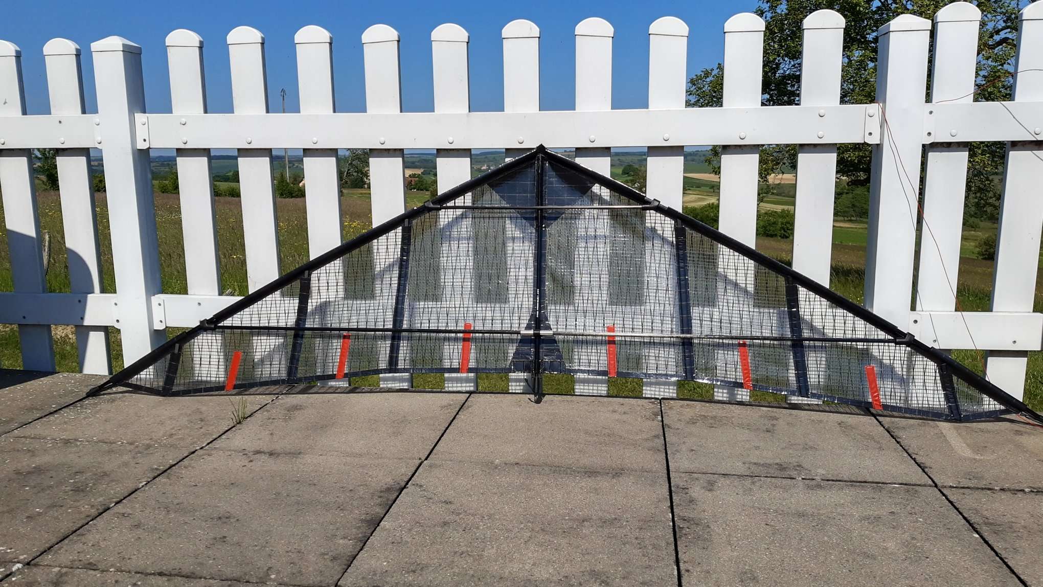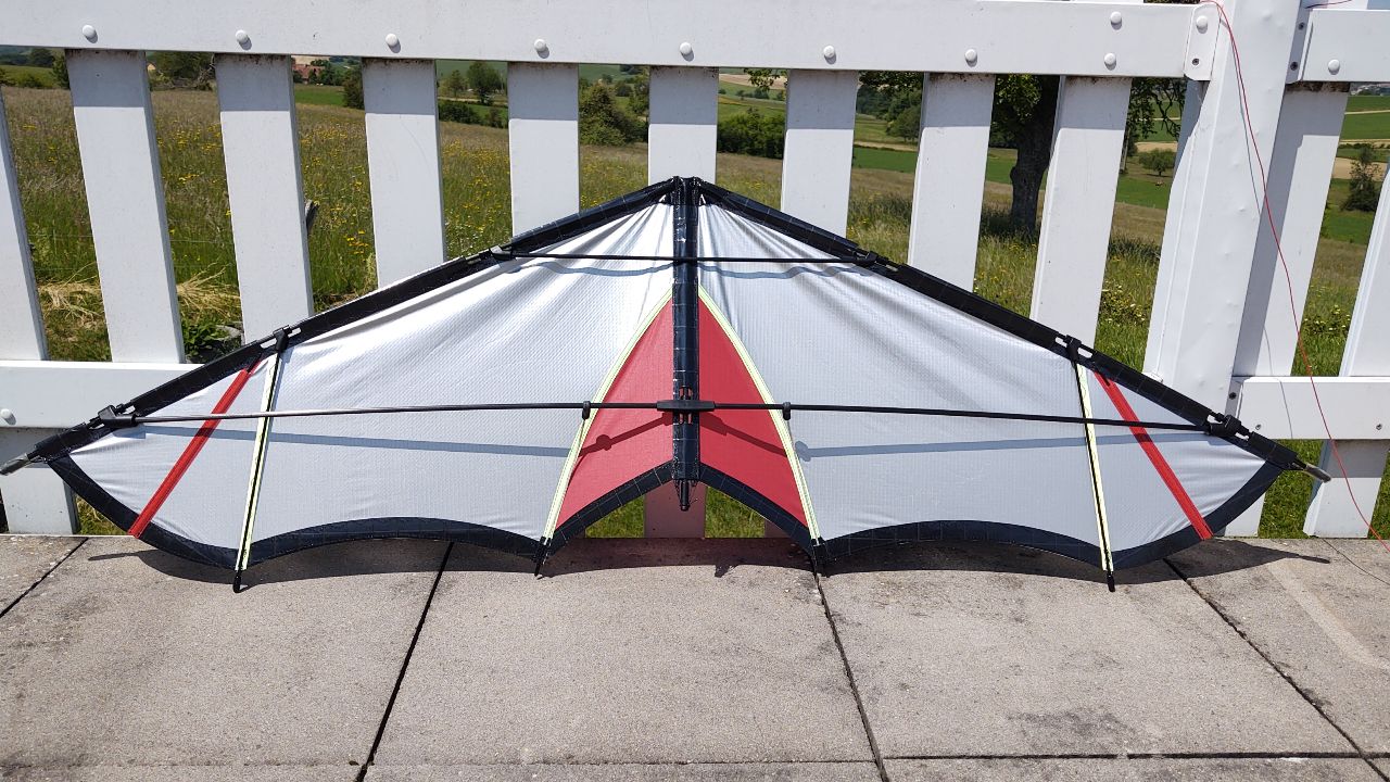 Dadurch, dass die Leitkanten bis fast in die Nasenspitze reichen und die Kiele vor der Nasenspitze enden klappen sich die Leitkanten vorne zusammen (gehalten von der oQS) und geben damit ein sauberes Profil über den ganzen Flügel. Die Leitkanten sind entsprechend profiliert und wenn man sie abspannt ergibt ein sehr gleichmäßiger flacher Bauch über die ganze Fläche.