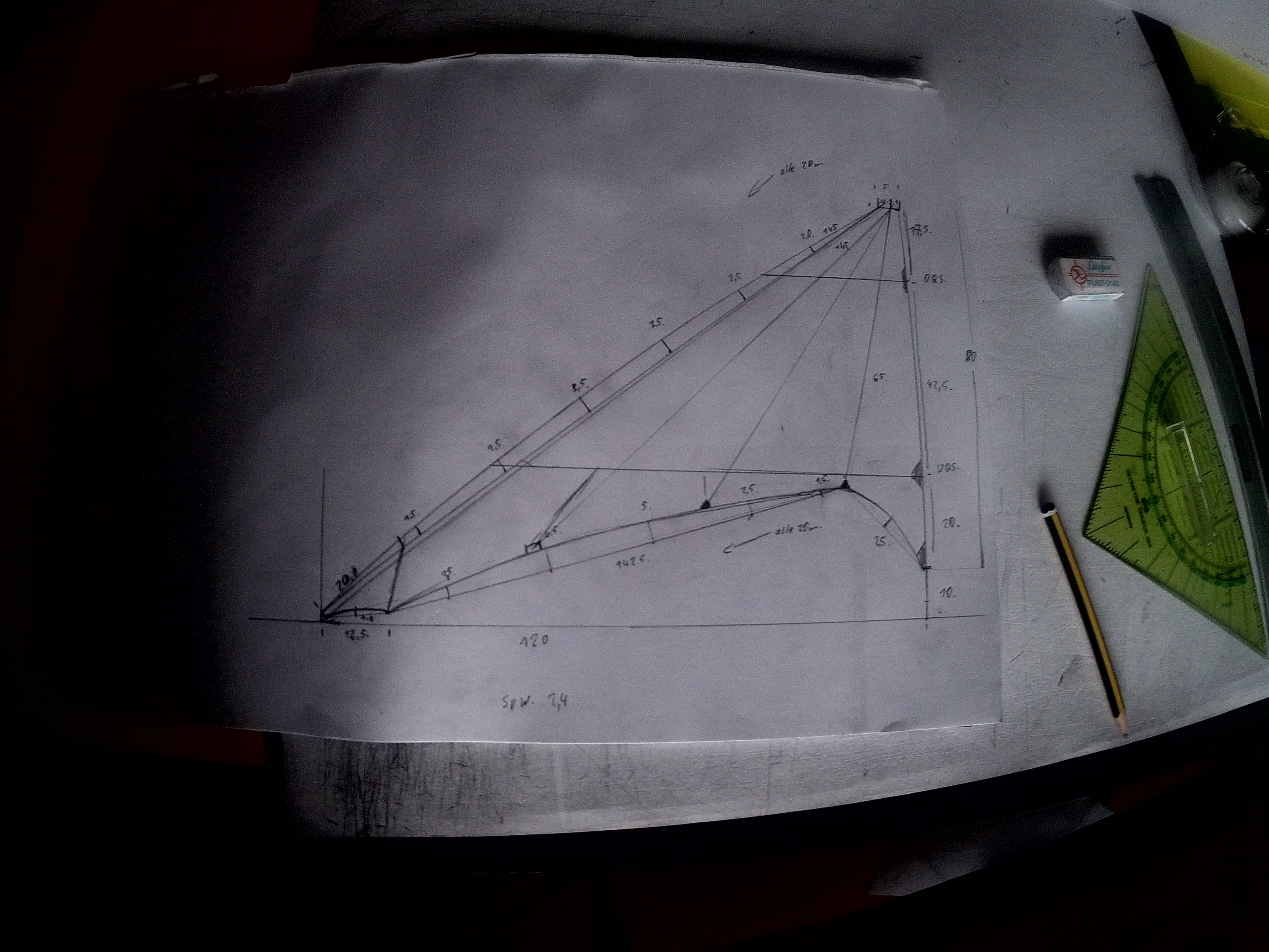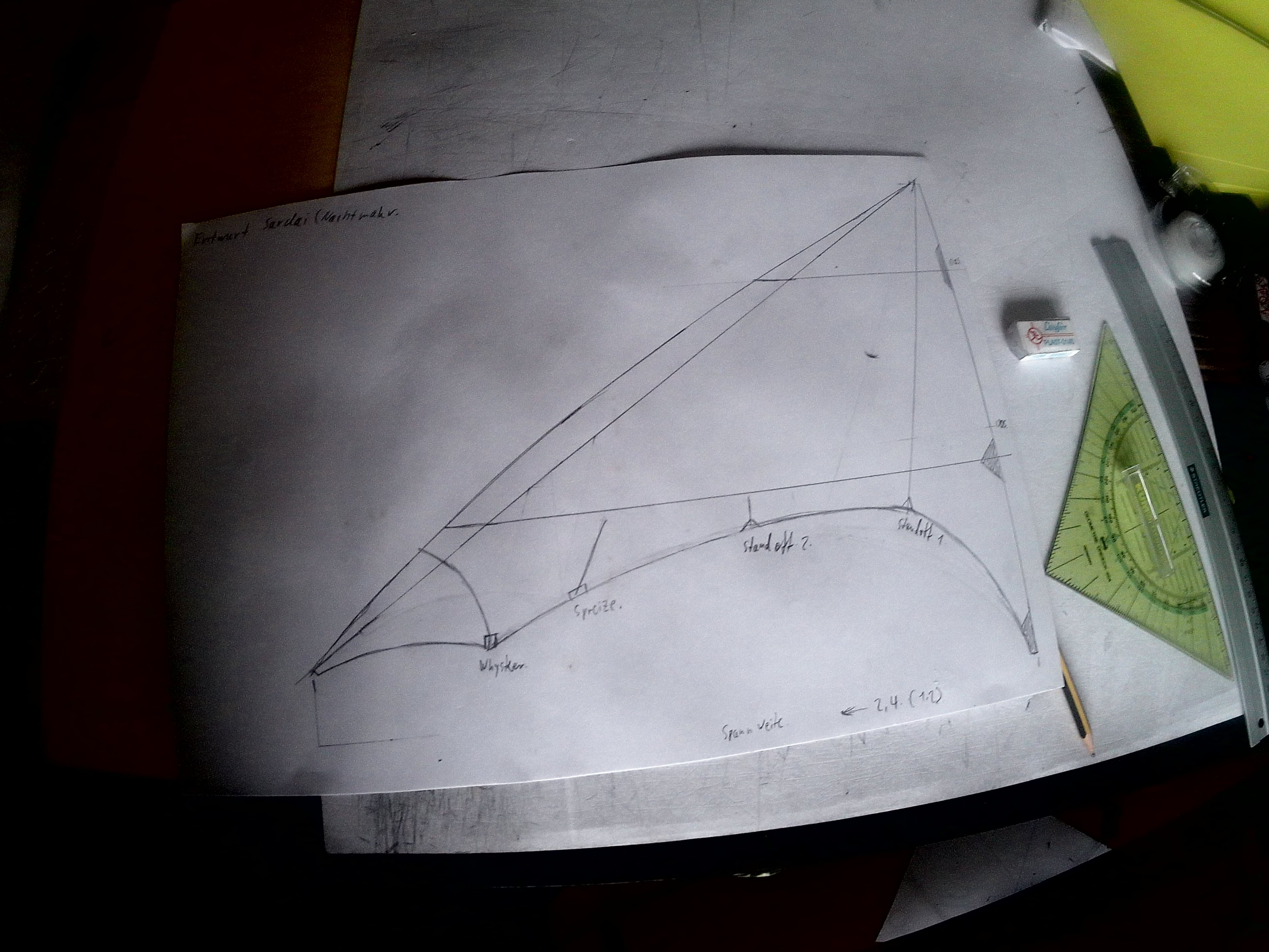 Gestänge: P400 XL Leitkanten, Skyshark pt7 + P400 in den Vertikalen, Aero Stuff Gold für den Bogenstab (später evtl. Skyshark 8p für Zweileinerbetrieb).Heute gehts dann an die Waage.