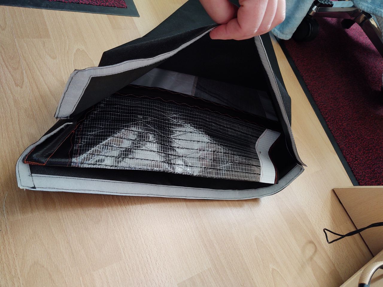 So kann man einfach die Spreizen rausnehmen und den Flügel mittig zusammenlegen und in die Tasche packen. Die Tasche ist aus innen beschichtetem Cordura.