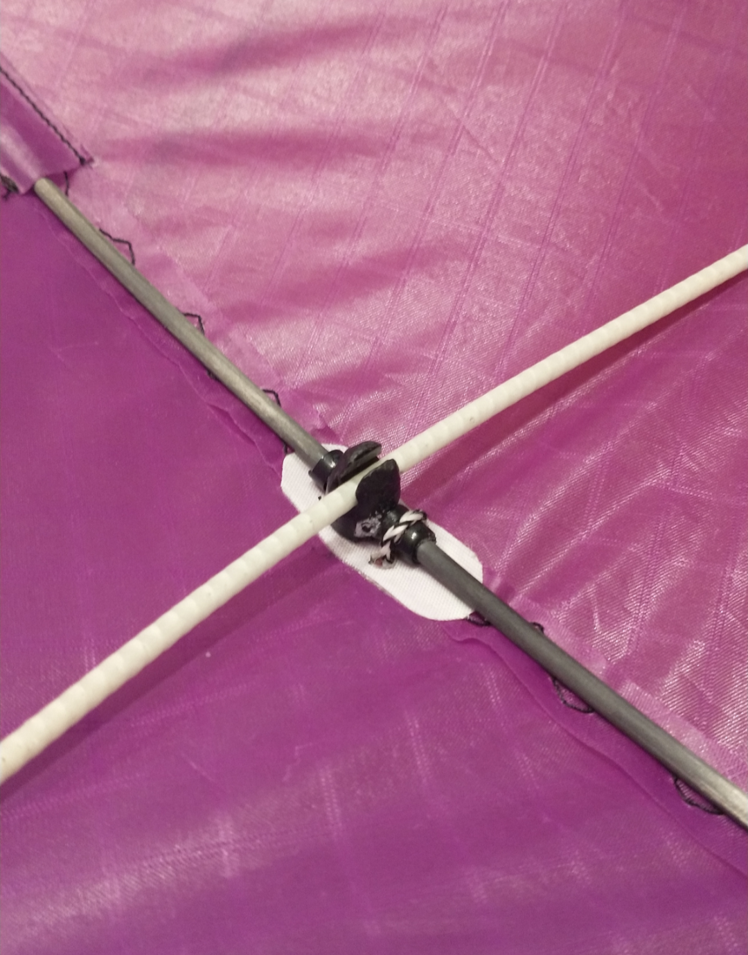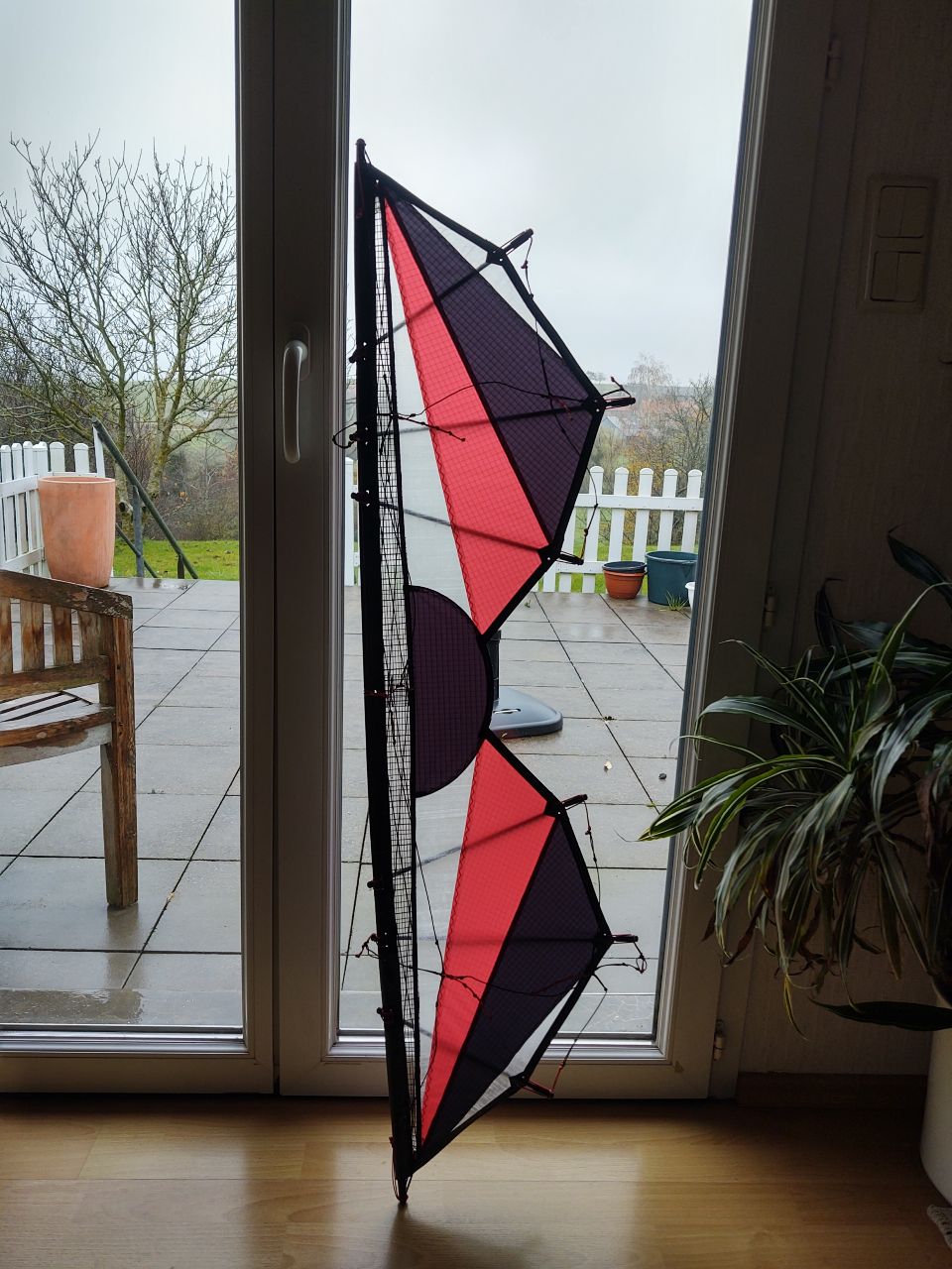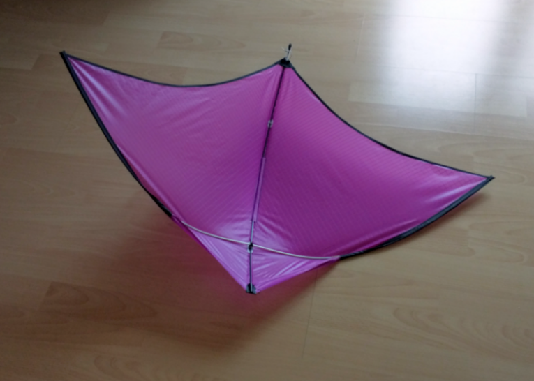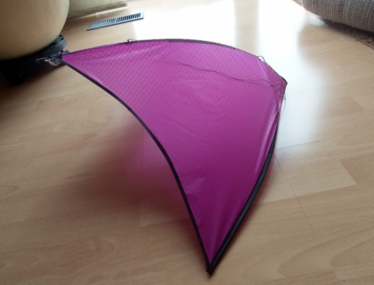 Maße: Spannweite 50 cm, Höhe 33 cm, Gestänge 0,8 mm CFK , Segel irgendein dünner Kunstoff ( glaube der I Flite ist auch daraus), Gewicht ca. 3,5 Gramm. Verbinder selbst gefertigt aus Kabelisolierung., Spannschnüre ist Nähgarn .