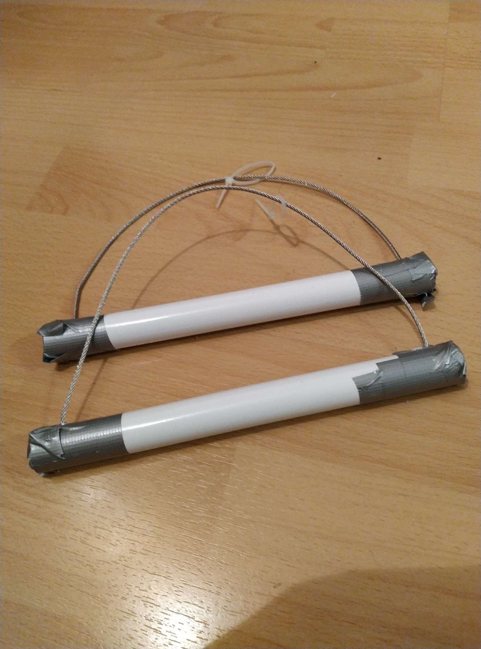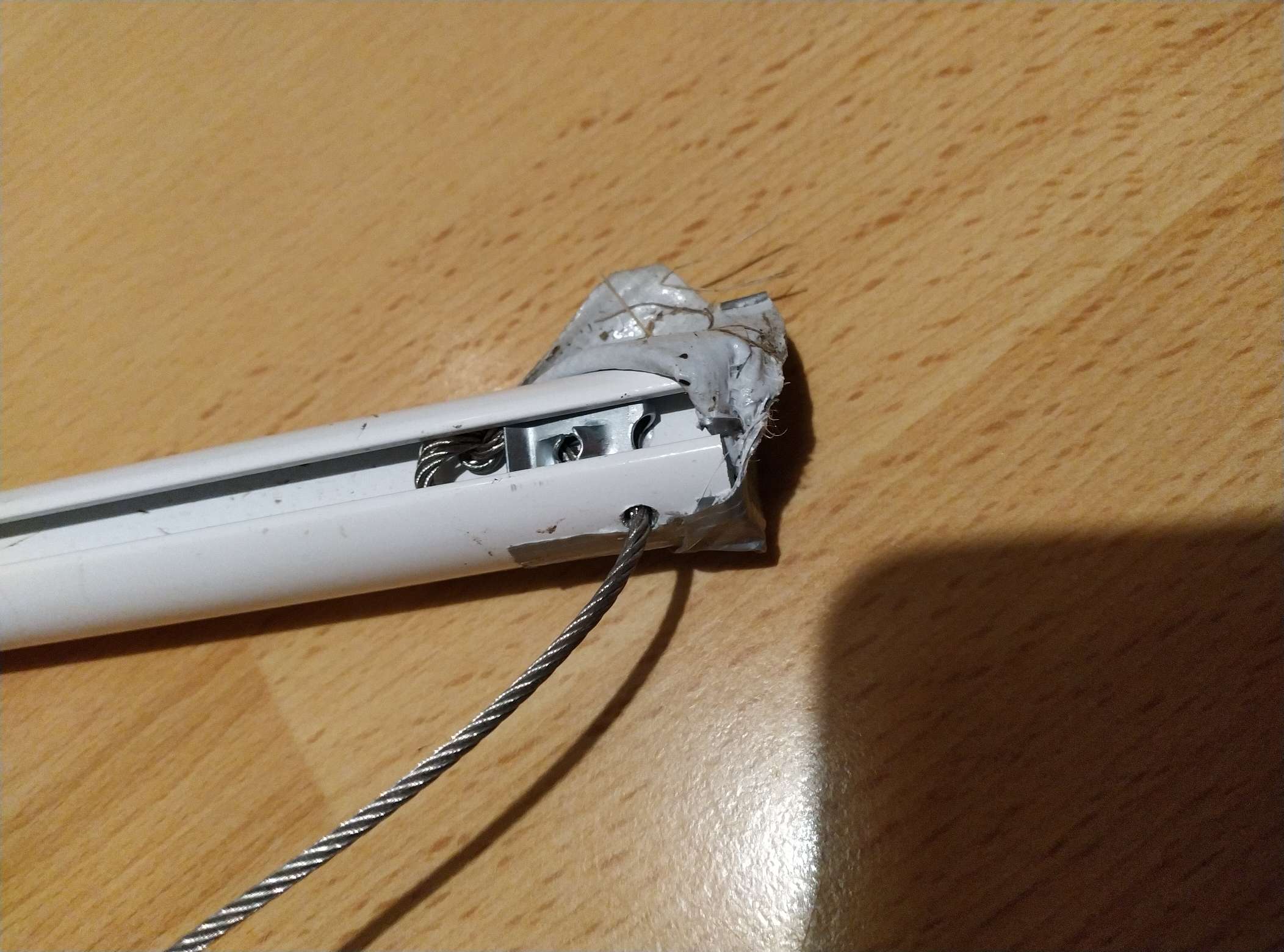 Potthässlich mit Textilklebeband an den Enden verklebt. Das Seil ist durch eine Bohrung in der Schiene geführt und wird mittels Metallklemme und einfacher Knotung geklemmt.