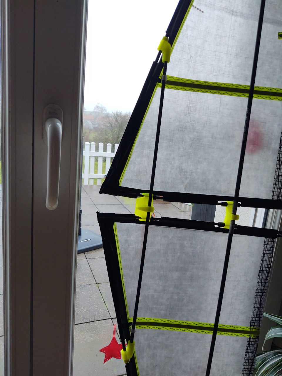 Die lange Segellatte ist aus breitem und recht steifem Kabelbinder. Die anderen Segellatten sind aus 0,5 mm dickem und 5 mm breitem Flach CFK. Also biegen sich schön und sind dennoch steif. Die Schleppkante ist komplett gerade bis auf den Wingletbereich. Das Profil entsteht aber durch die Abspannung der Vorprofilierten Paneele (also Konvexer Leitkanten- und Kielbereichverlauf). Die 2 Abstandhalter oben an der oQS wo etwas auf die lange Segellatte drücken sorgen nur dafür, dass sich die Welle etwas glatter bildet im Stand. Man könnte sie auch weglassen und das Profil wäre dennoch stabil, aber halt oben mit einer kleinen sichtbaren Beule. Diese Beule wäre dann allerdings mit ganz wenig Wind im Segel auch schon raus dann. Das Reinziehen der Profilierung erfolgt wie gesagt über das Abspannen der Leitkanten und Kiel und funktioniert nur mit Material wo sich nicht groß dehnt. Würde man den Flügel aus Spinnacker bauen müsste man also entweder sehr sehr festes Tuch nehmen oder ggf. eine Mylar/Cuben Verstärkungen in die Bereiche einbauen oder zwei zusätzliche Paneele pro Segelhälfte machen.