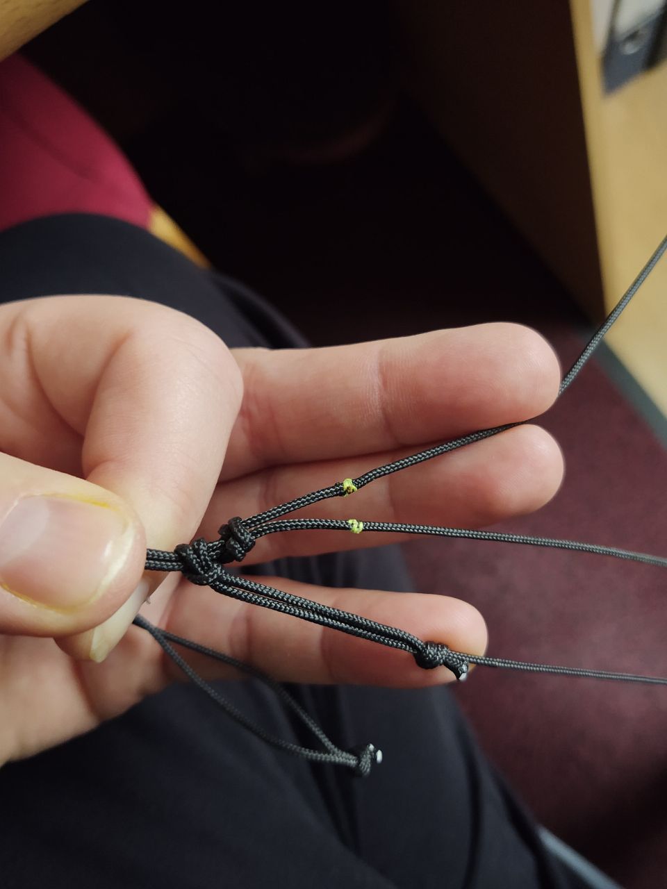 Auf der schwarzen Waage siehst keine Markierung richtig für den Schiebeknoten. Also... mit neongelben Faden die Markierungen von Hand eingenäht: