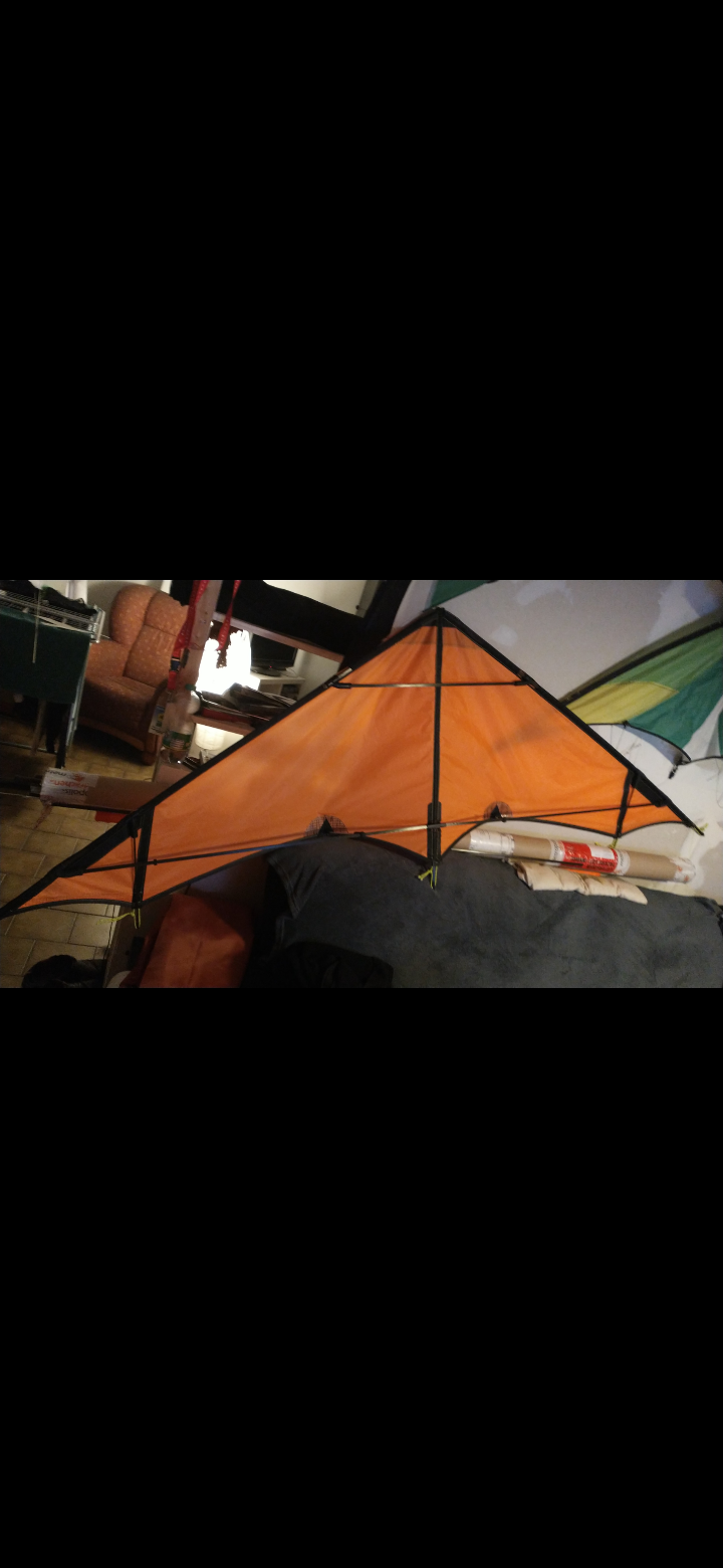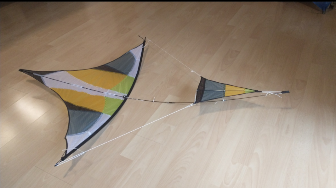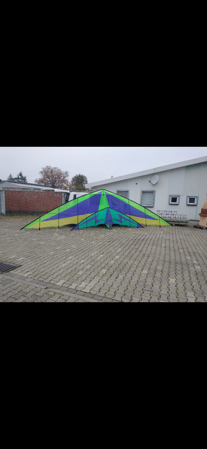 Mittlerweile ist der Drachen mit zusätzlichen Fangschenkeln ausgerüstet, zusätzlich noch ein GFK Rohr über dem 14er cfk um auf der Länge mehr Stabilität zu erhalten. Ausserdem habe ich noch Powerlines installiert um das Profil zu begrenzen.