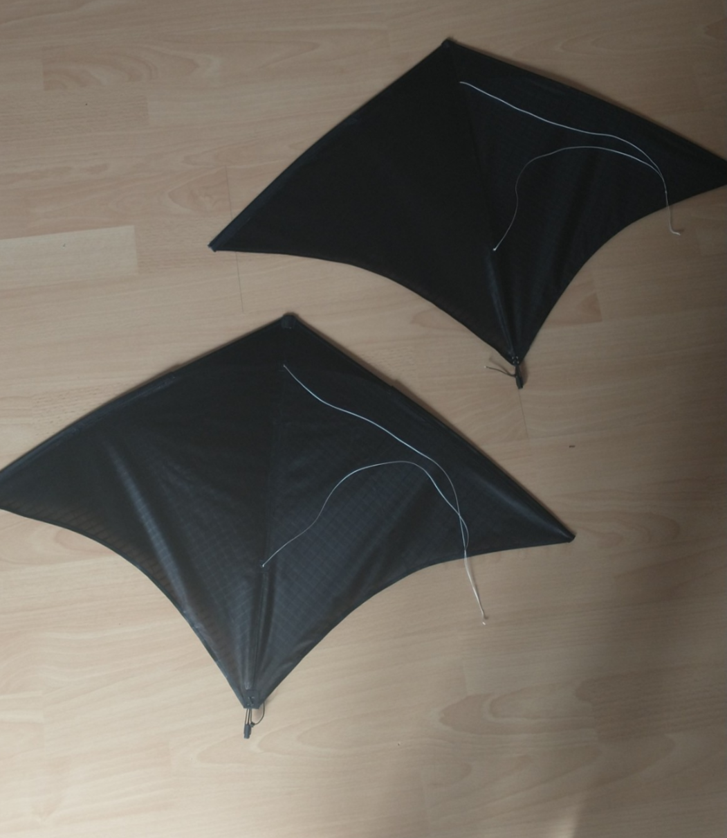 Hab 2 kleine schwarze gebaut, inspiriert von Christopher Tournays Ginga hab ich 2 kleine Freestyle Figther gebaut. Beide ca. 13 Gramm schwer. Gestänge aus 1,5 mm CFK , Tuch Polyester, ca. 68 cm Spannweite. Unterscheiden sich nur etwas im Gestänge Aufbau.