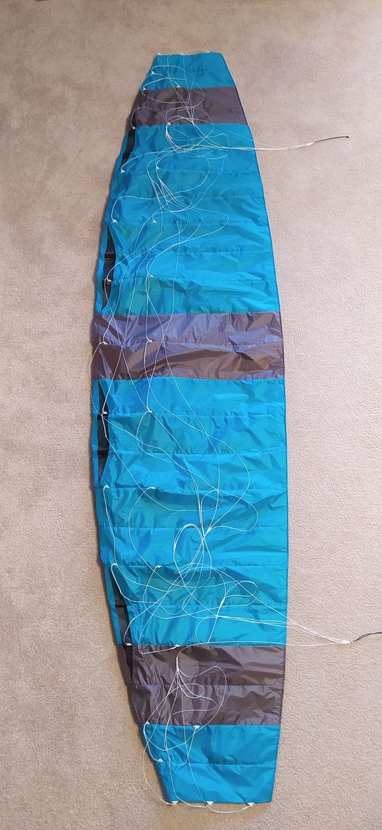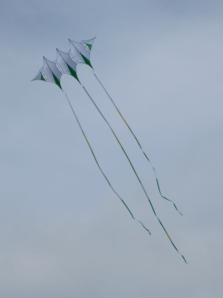 Was ich nach der Landung noch machte, die untere Leine (von Kielende zu Kielende) etwas kürzer gemacht, die verhindern soll, dass die beiden äußeren Kästen mit der Segelspitze sich zum Inneren Kasten drehen und so der Drache nicht gerade ist.