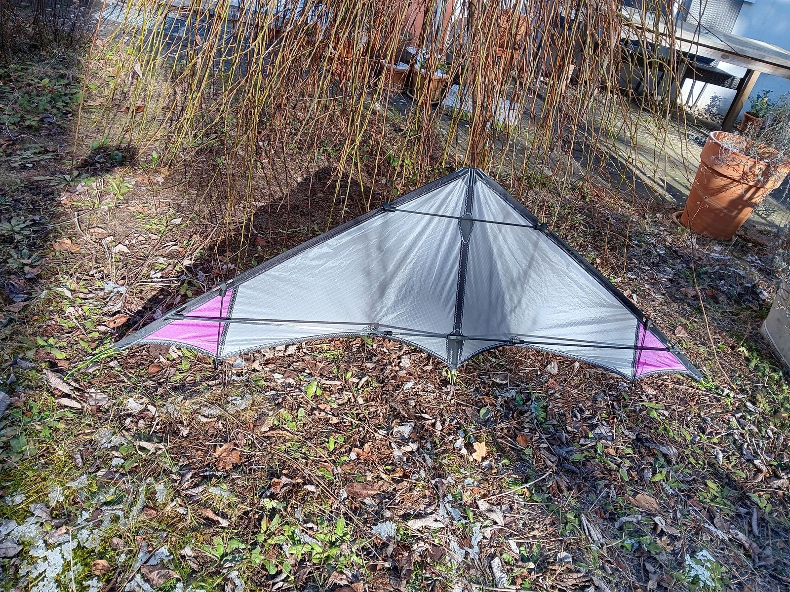 und ein leicht bestabter 3.14M, die Waage fehlt noch. Abweichend vom Plan sind die Stäbe dünner (wie bei der leicht bestabten Schantalle), das Segel aus Icarex und die Taschen aus 60D Spi.