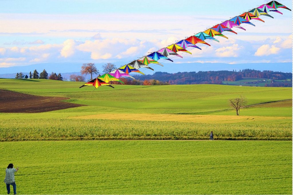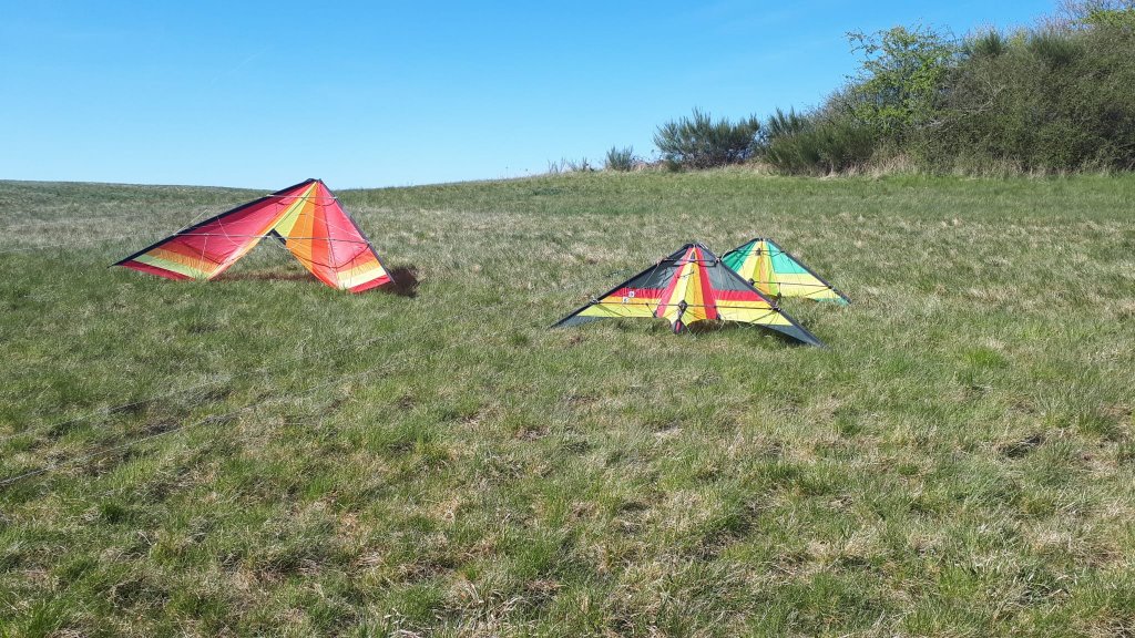 Nachdem wir die Waage gefühlt 100 mal um gebastelt hatten und jedes Mal der Weg zu den Schlaufen lang war, testete ich zunächst ob mein kleiner Long Dart mit 2m Spannweite mit den Windverhältnissen zurecht kommt - o.k. dann nutzte ich die Koppelleinen des Long Dart um die beiden Hawaiian Darts hinter den Long Dart zu klöppeln und zu fliegen o.k.Als das Alles flog, knüpfte ich kurzerhand die Waag des Long Darts an den Hawaiian Dart Leitdrache. Da ich immer mit 5 Knotenleitern meine Drachen baue, war das auf der Wiese schnell geschehen. Ergebnis: das 2er Gespann lief sauber. Und es machte Spaß die beiden "Kleinen" über den Himmel zu fliegen.