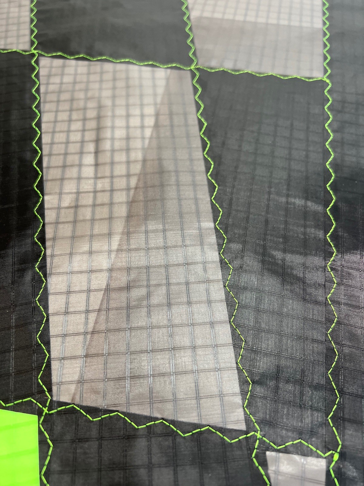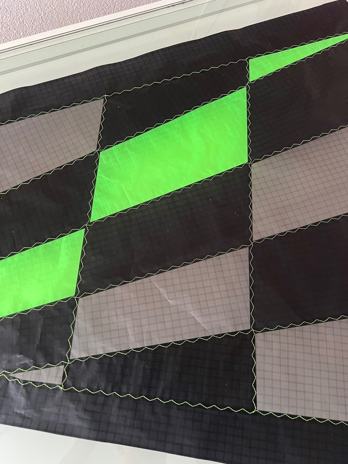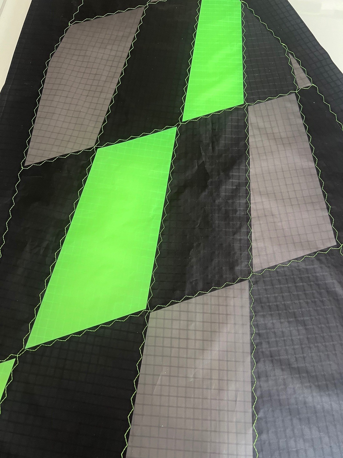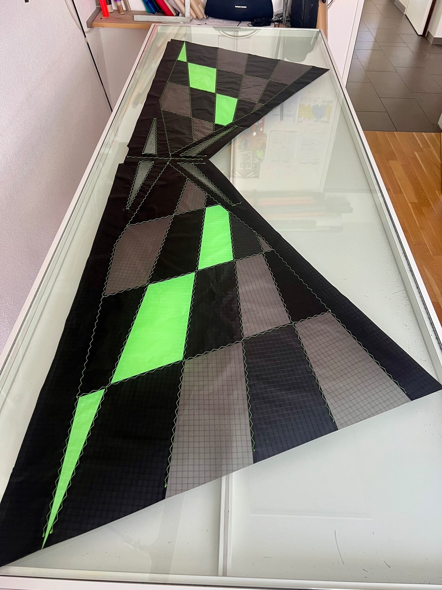 einem Arbeitsschritt das gesamte Segel ausgeschnitten. Bei den Upycled Stoffen muss man sowieso mit viel Gefühl arbeiten, um sie nicht verziehen,