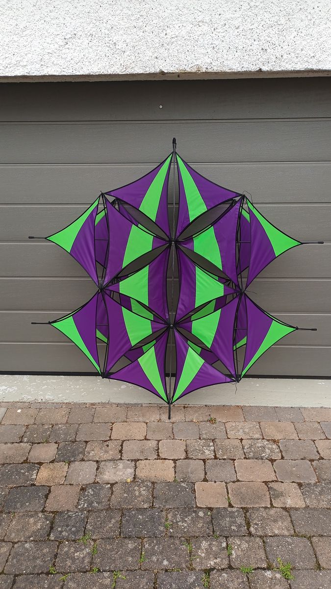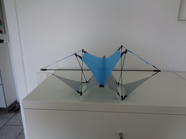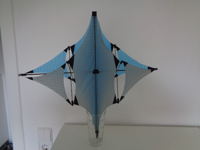 Beim einfachen Crossdeck werden die Flügel mit je einem Paar gekreuzt Stäbe aufgespannt. Die Stäbe enden in Splitkappen die dann zwischen äußeren und mittleren Segel eingehakt werden. Ich hab Lochkappen gedruckt, sodass die Kappen am Segel bleiben. Auch das erleichtert den Aufbau sehr. In der Mitte treffen bei dem Doppelcrossdeck ja 2 diagonalen aufeinander. Klar könnte man die Verbindung zwischen den Sgel etwas länger machen und zwei Lochkappen einknote. Ich hab da ein Winkelstück gedruckt, das macht es etwas harmonischer.