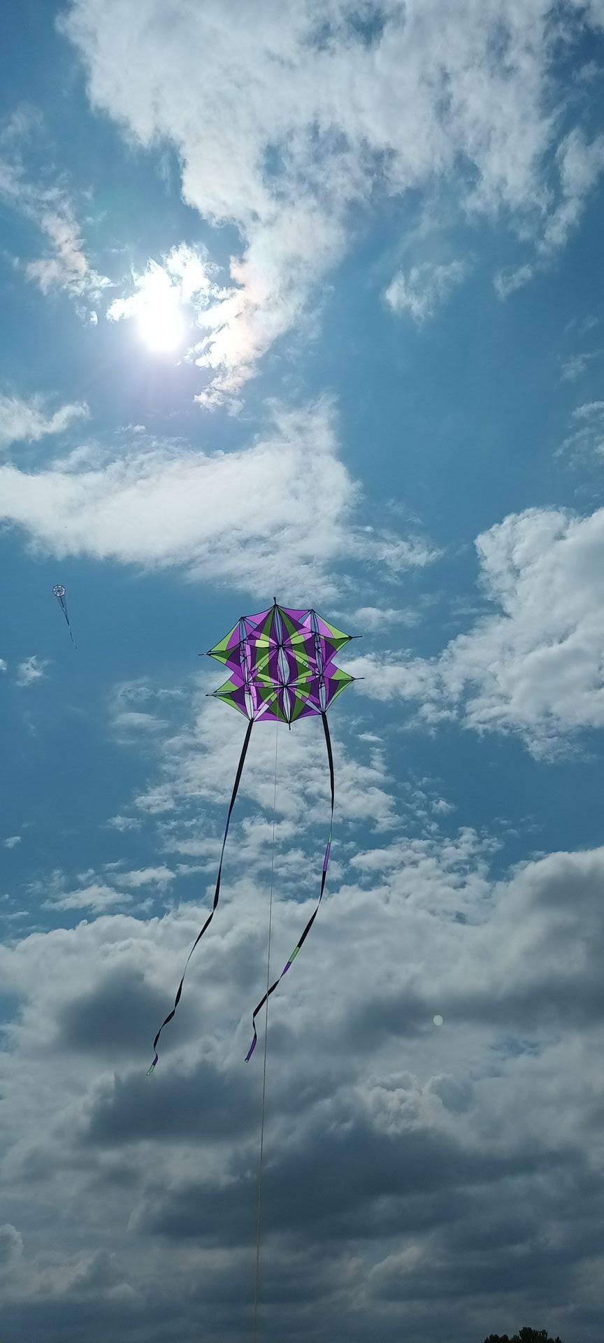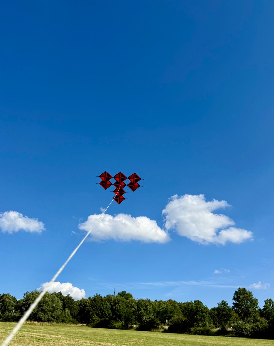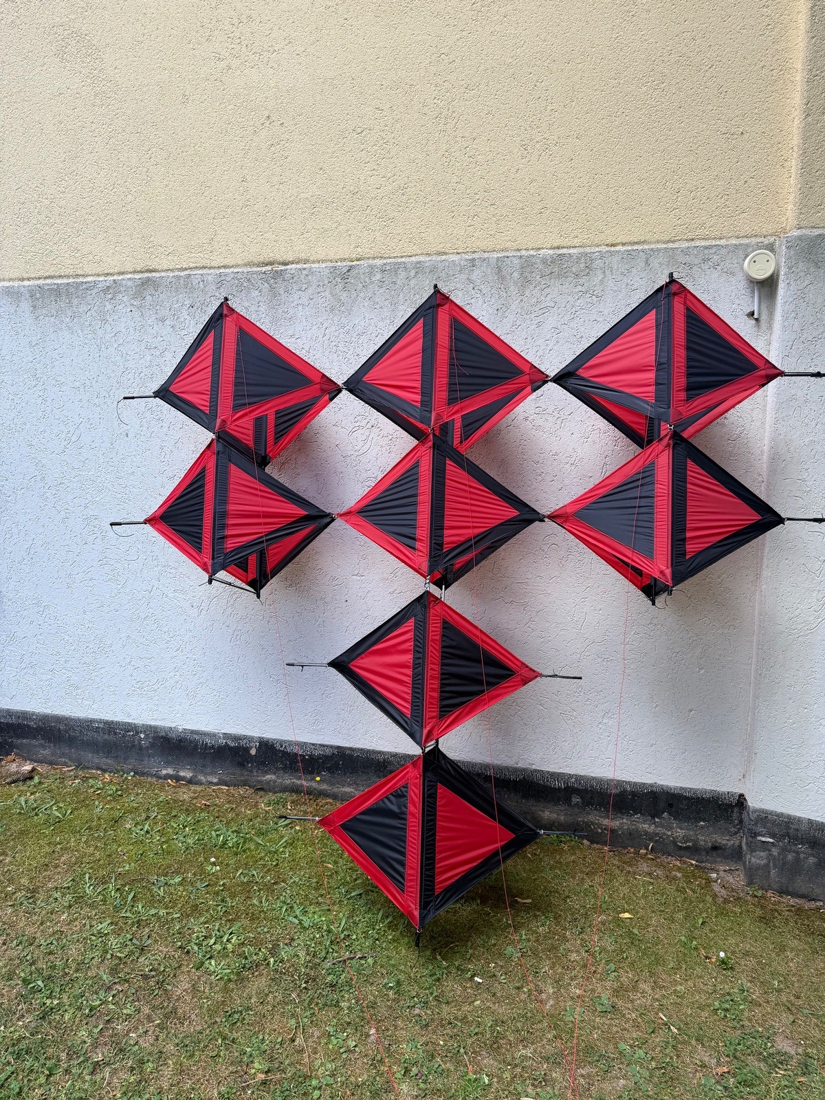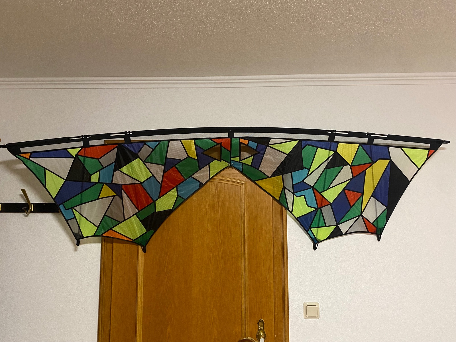 Im Prinzip ja, ein Freund hatte mir mal eine Skizze als Flachdrachen gezeigt. Ich hab daraus sozusagen die Kastendrachenvariante entwickelt. Ein wenig über Farbkombis nachgedacht und schließlich Masse und Konstruktion der Gestänge nach meinem Gusto gebastelt.