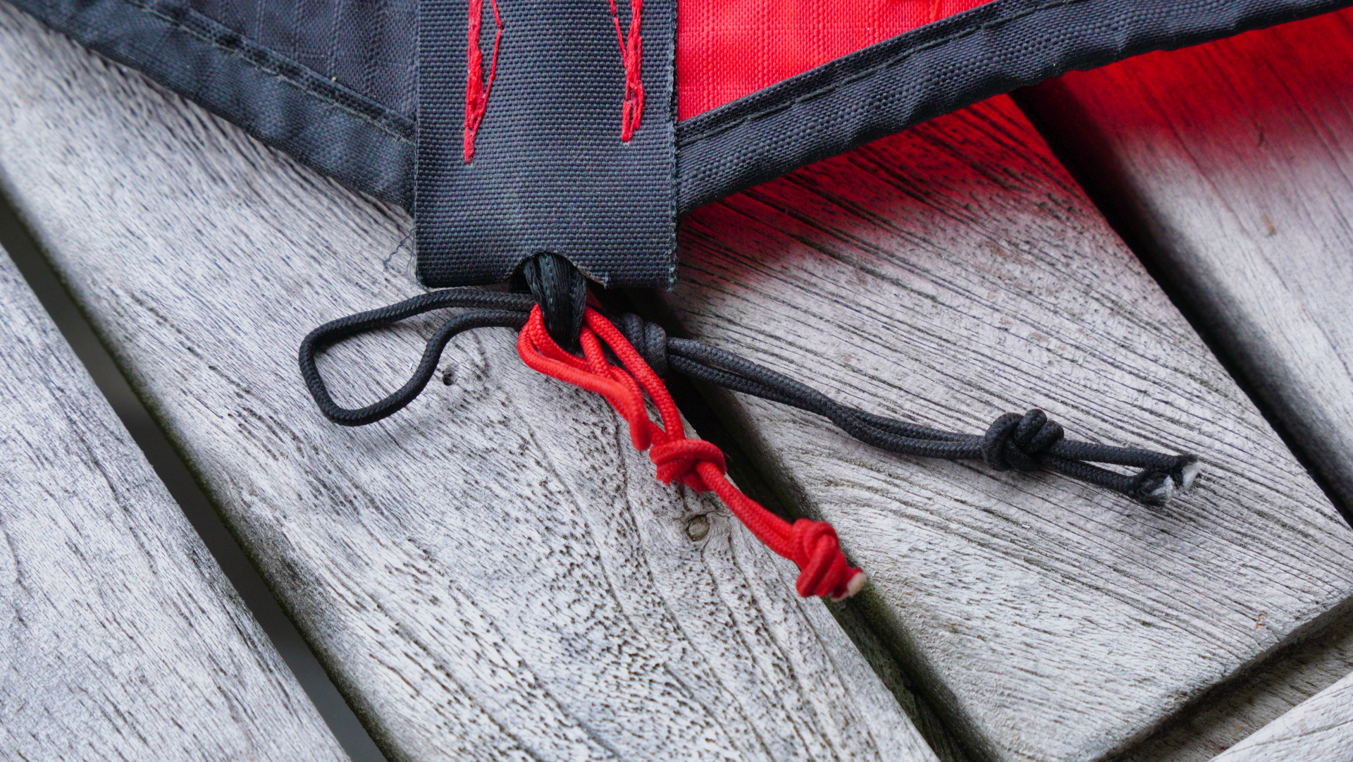 Also erst Verbinder, dann Splitnocke in die Schlaufe (den Teil ohne Knoten), und dann am Knoten anpacken und abspannen ( dann hängt der eine Knoten an der Nocke, der äußere Knoten ist zum Anpacken).