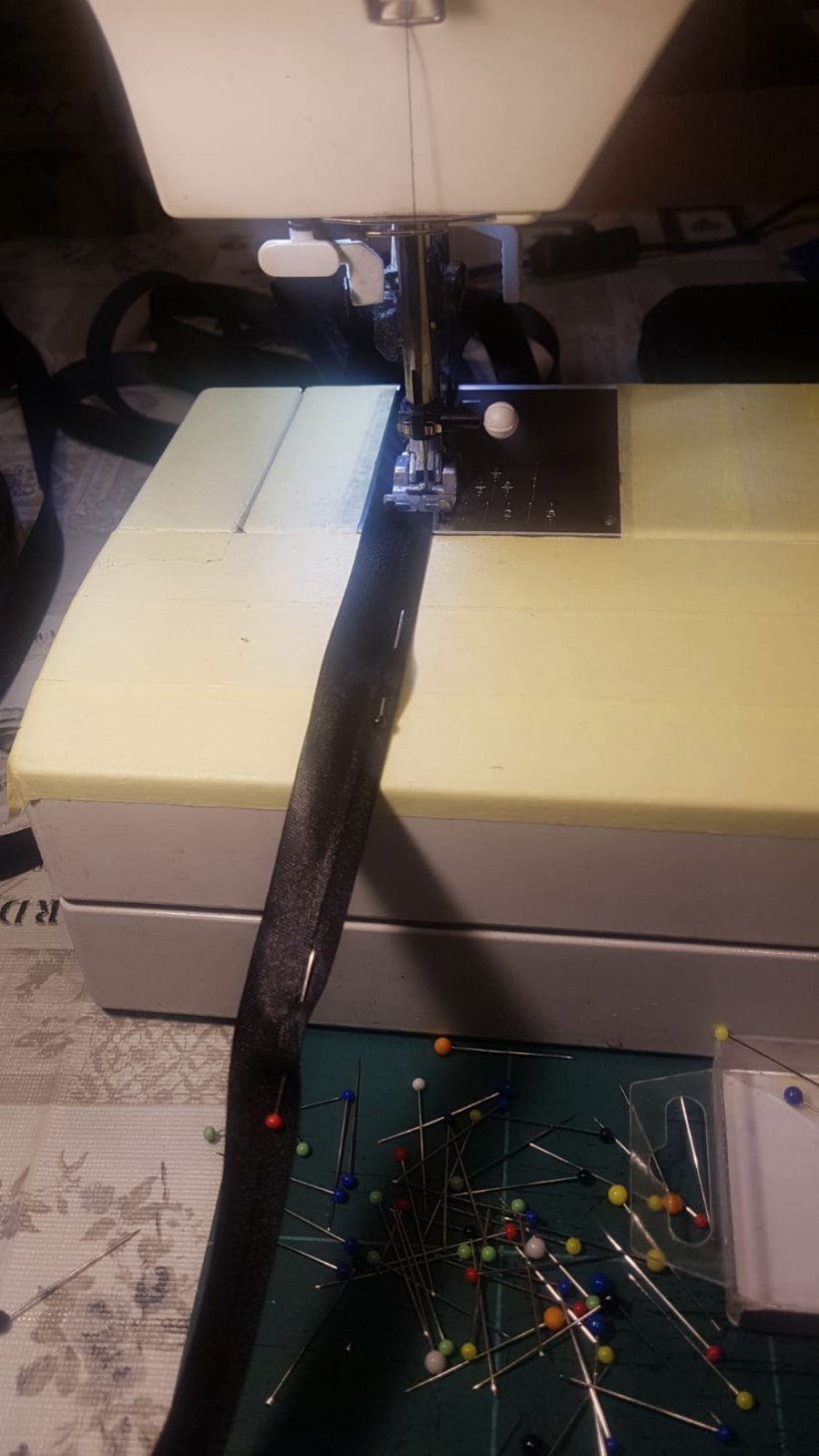 ich habe 2 Saumbänder - diese doppelt gefalzten 15mm Bänder auf einer Seite mit einem engen ZickZack zusammen genäht. Dann die Schräge Schnittkante des Organzas da reingefaltet und mit einer Stecknadel gesichert. Zum Schluss mit einer einfachen Naht ziemlich am Rand des Saumbandes zusammengenäht.