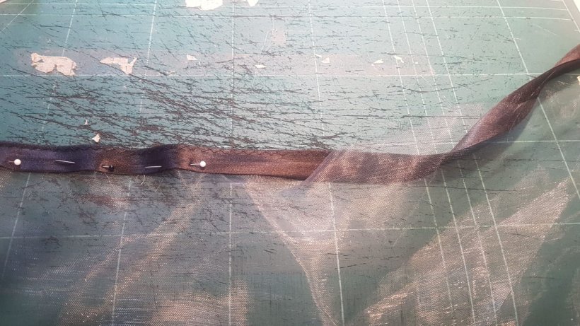 Als nächstes den Organza in das Schrägband falten und zusammen stecken.